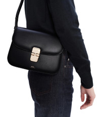 A.P.C. Women's bag. - Supple cowhide leather. - Adjustable leather shoulder strap. - Can be worn on the shoulder or across the chest. - Goldtone hardware clasp. - Flap lined in cowhide suede split. - One large compartment. - Two large pockets. - Two goldtone rings on sides. - Embossed goldtone 'A.P.C. Rue Madame Paris' logo. Size Advice - Cotton lining. - Dimensions: 9.8 x 7.9 x 2.4. - Larger version of the Grace Small bag and Grace Mini bag. Composition & Material - 100% cowhide leather. - Spanish material. - Made in Morocco. - Care instructions: wipe with a soft dry cloth.