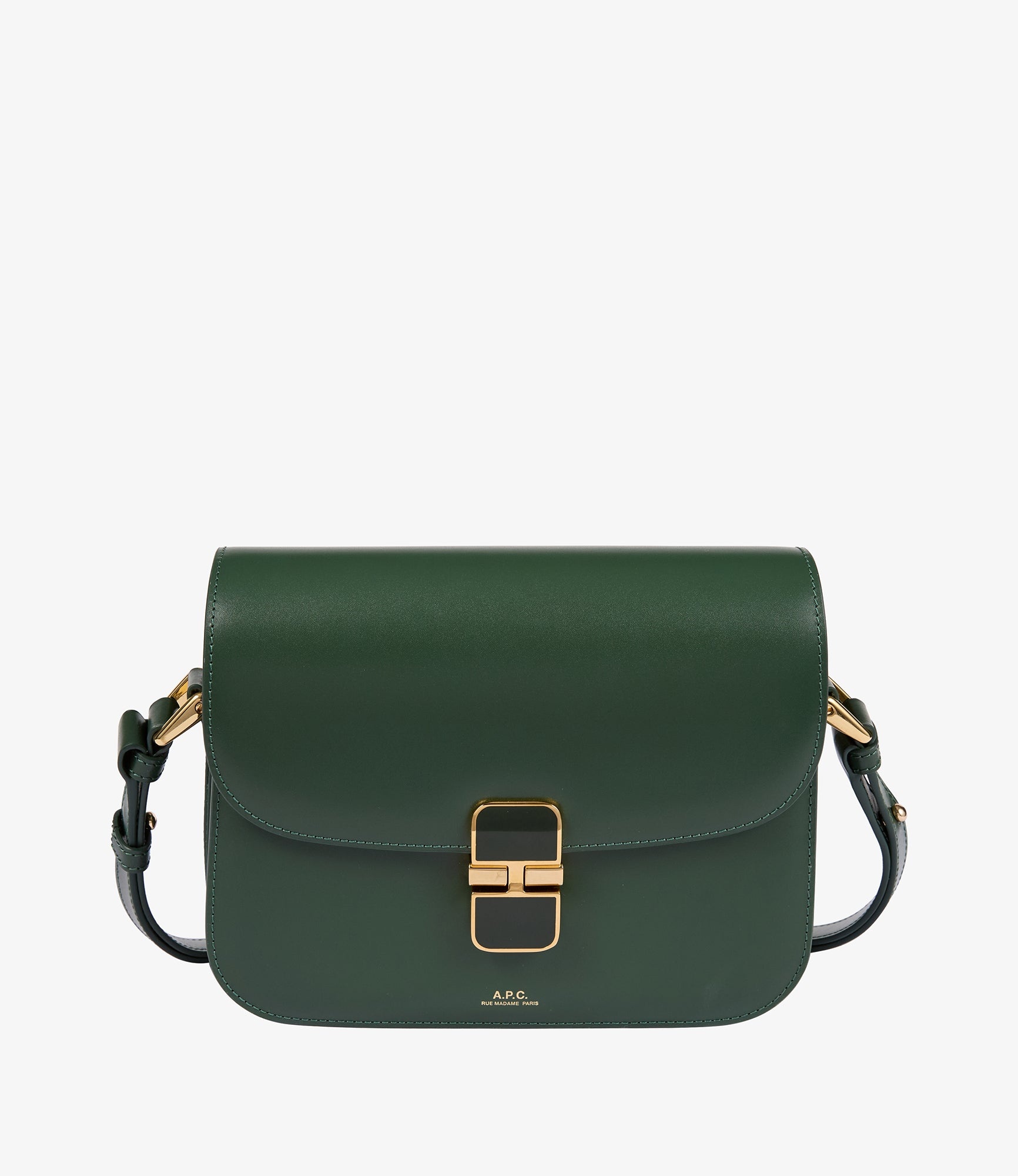 - Leather bag inspired by chic vintage bags in a small format. - Supple cowhide leather. - Adjustable leather shoulder strap. - Can be worn on the shoulder or across the chest. - Goldtone and black hardware clasp. - Flap lining in cowhide suede split. - One large compartment. - Two large pockets. - Two goldtone rings on the sides. - Embossed goldtone A.P.C. Rue Madame Paris logo. Size Advice - Cotton lining. - Dimensions: 21 x 17 x 5 cm. - Adjustable shoulder strap: 36 cm and 49 cm. - Smaller version of the Grace bag and bigger version of the Grace Mini bag. Composition & Material - 100% cowhide leather. - Spanish material. - Made in Morocco. - Care instructions: wipe with a soft dry cloth. - Avoid poor weather conditions which can potentially damage the leather.