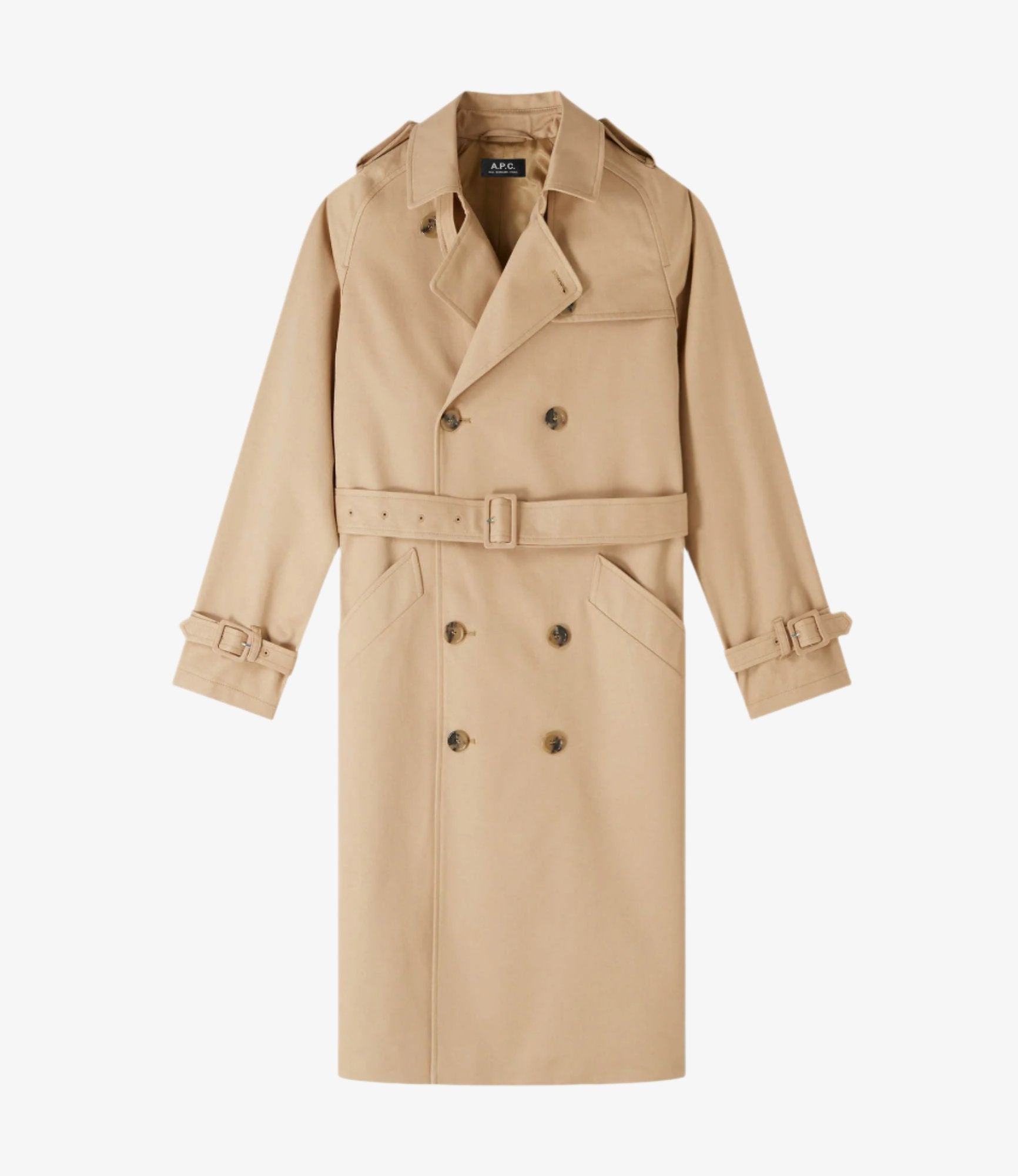 A.P.C. Women's coat. - Fits loose to allow for layering. Size down 1 size for slimmer fit. - Straight long and flared cut. - Waterproof material. - Raglan armhole. - Double-breasted crossover closure. - Buttoned placket at the shoulders. - Adjustable waist with a removable belt. - Wrist buckle tab. - Jacquard lining. Size Advice - Caroline is 5'9 tall and is wearing size S. - Fits loose to allow for layering. Size down 1 size for slimmer fit. Composition & Material - 100% Cotton. - Dry clean.