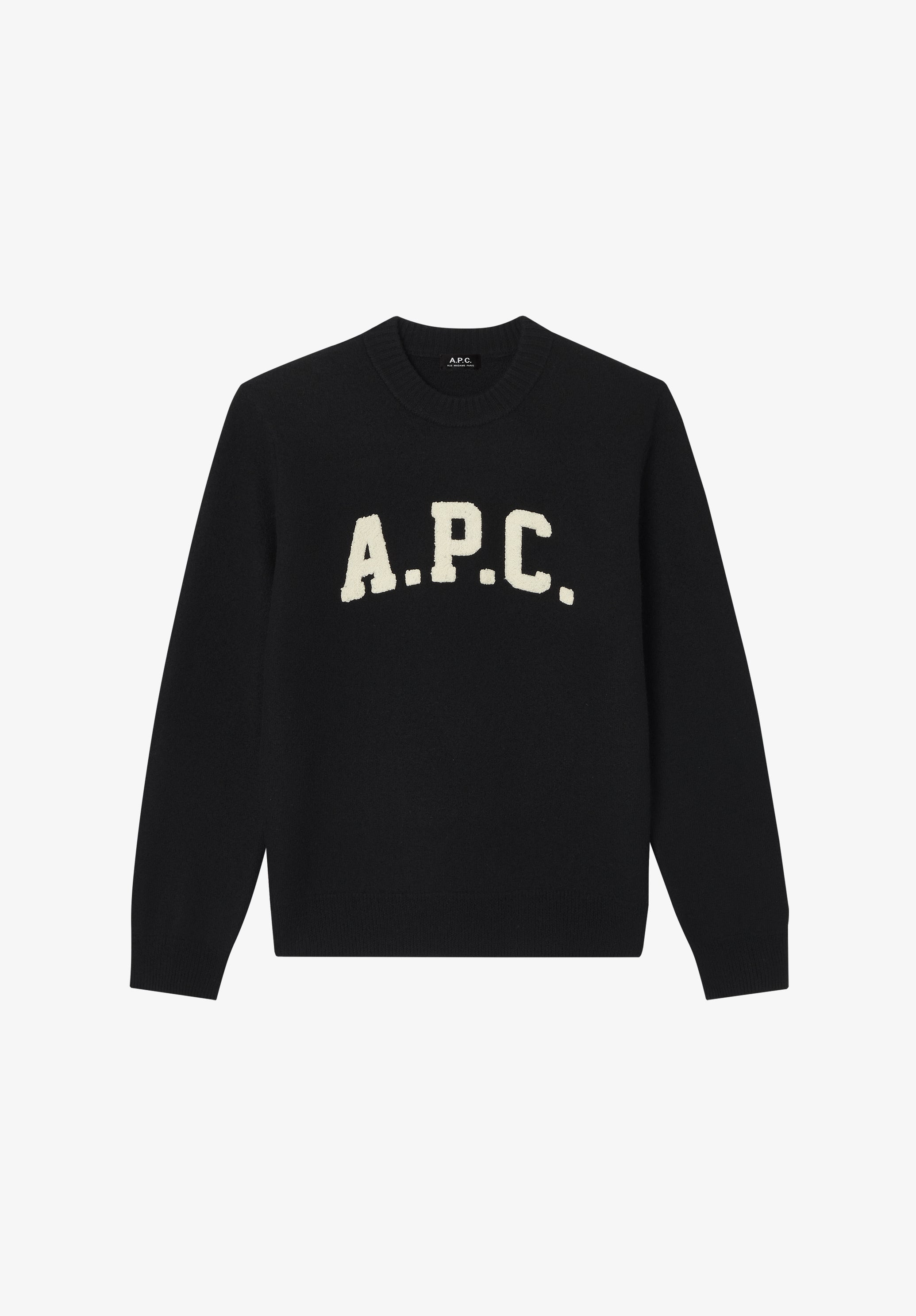 - Soft warm and thick material. - Straight cut with a slightly loose fit. - Crew neck. - Ecru chenille A.P.C. logo. Size Advice - Adam is 6'1 tall and is wearing size M. Composition & Material - 100% wool. - Made in Hong Kong. - Hand wash or delicate cycle.