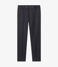 - Straight cut. - Mid-rise. - Elasticated waistband with a faux horn button. - Full-length permanent crease. - Zip fly. - Two side pockets and one back pocket. Size Advice - Tristan is 6'1 tall and is wearing size 48. - This item sizes normally. We recommend that you select your usual size. Composition & Material - 90% cotton. 10% wool. - Italian material. - Made in Romania. - Dry clean only.