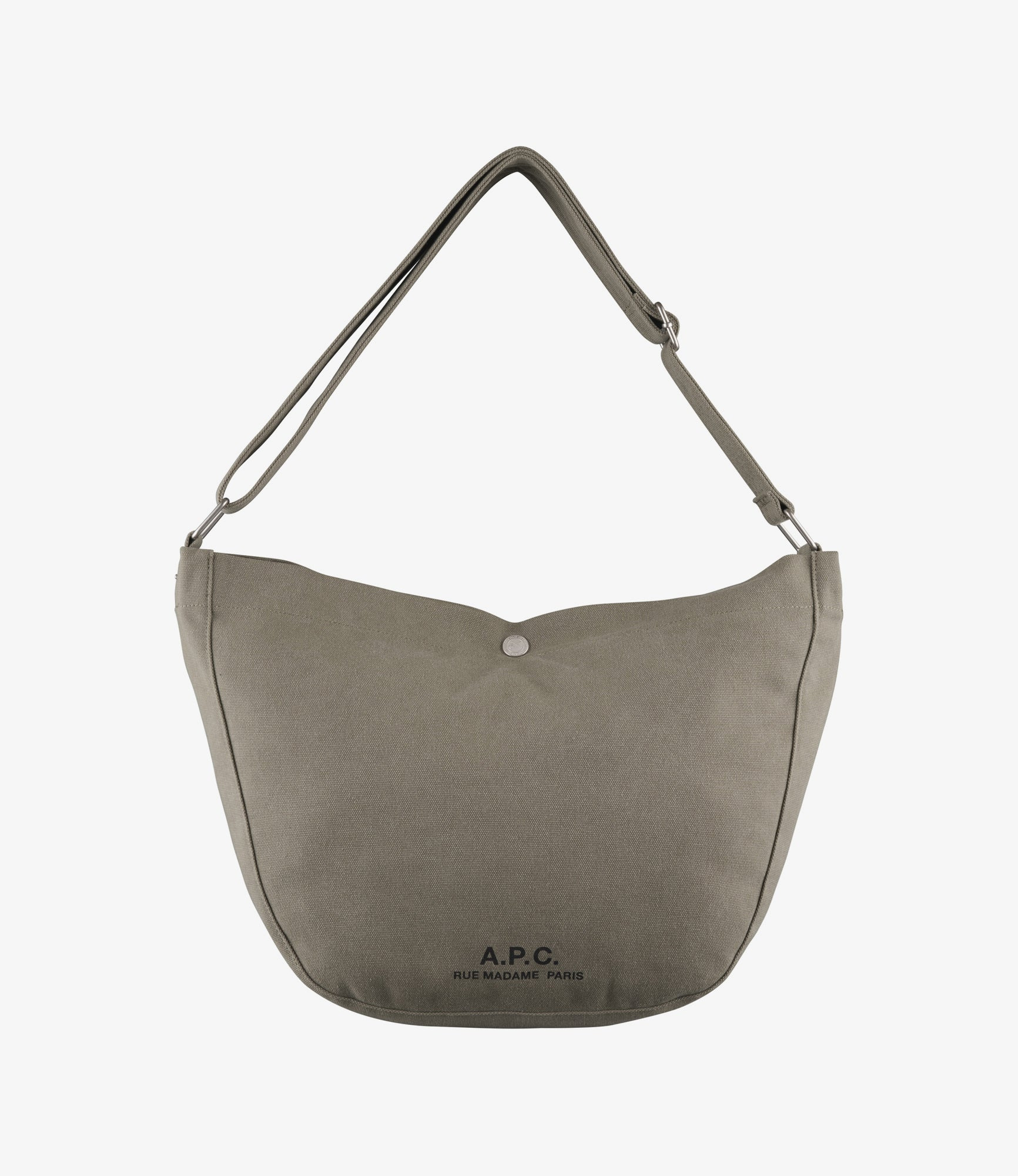 - Durable material. - One large compartment with a snap button. - One interior pocket with the A.P.C. logo. - 'A.P.C. rue Madame Paris' logo printed on the front of the bag. - Adjustable shoulder strap to wear the bag on the shoulder or across the chest. - 40% recycled polyester. Size Advice - Dimensions: 12.6 x 12.6 x 5.3. Composition & Material - 60% cotton. 40% polyester. - Made in China. Our commitments Through its RESPECT program A.P.C reduces (by implementing many practical measures to improve its environmental footprint) regulates (by respecting and enforcing its ethical responsibility on the part of its employees as well as its suppliers) and reuses (through its recycling vintage or quilts and butler programs for example).
