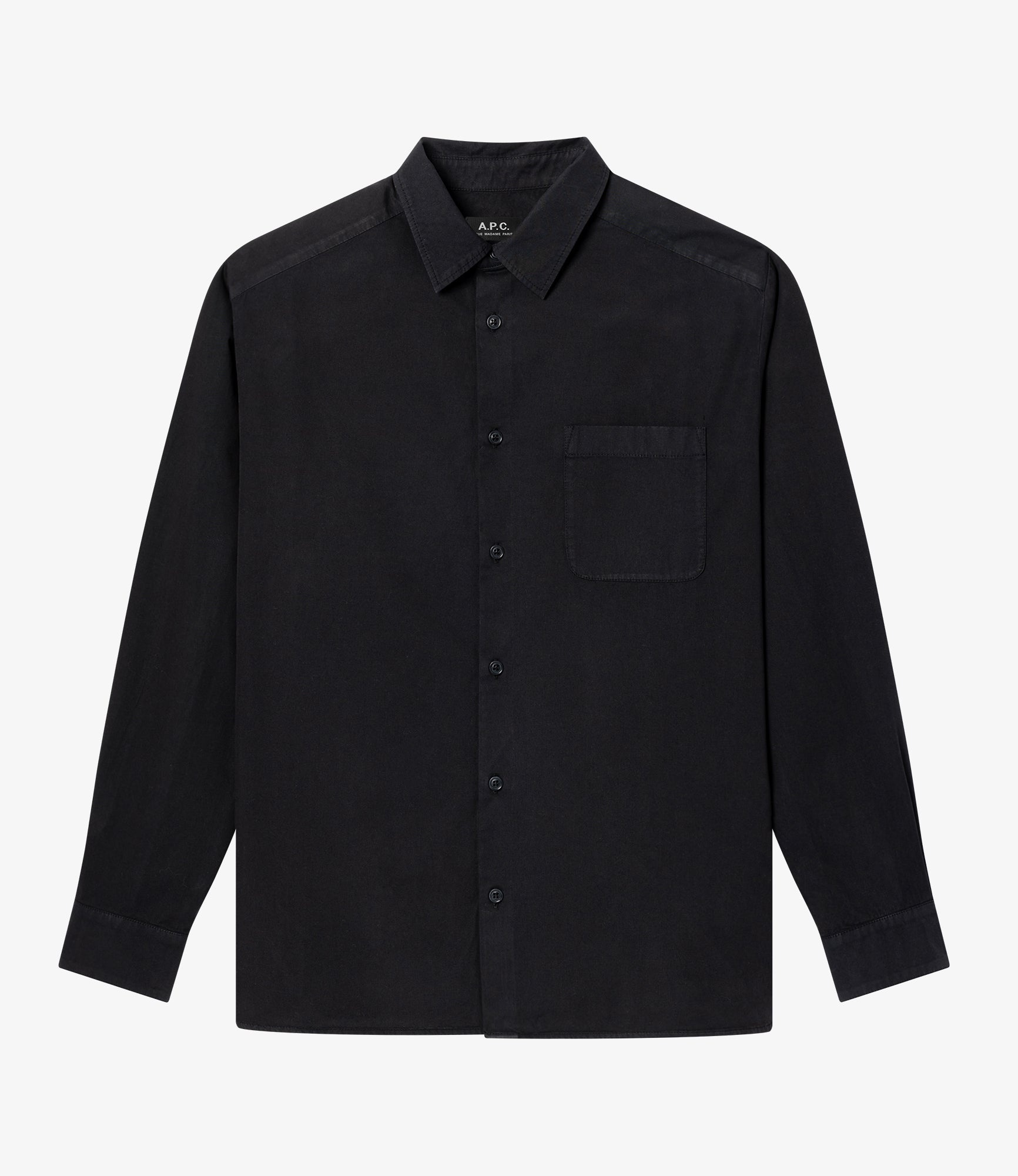 - Dyed vintage-effect material. - Straight cut. - Classic collar. - One pocket over the heart embroidered with the A.P.C. logo. - Faux horn buttons. - 100% organic cotton. Size Advice - Tristan is 6'1 tall and is wearing size M. - This item sizes normally. We recommend that you select your usual size. Composition & Material - 100% cotton. - Spanish material. - Made in Tunisia. - Machine wash cold (86°F) inside-out.