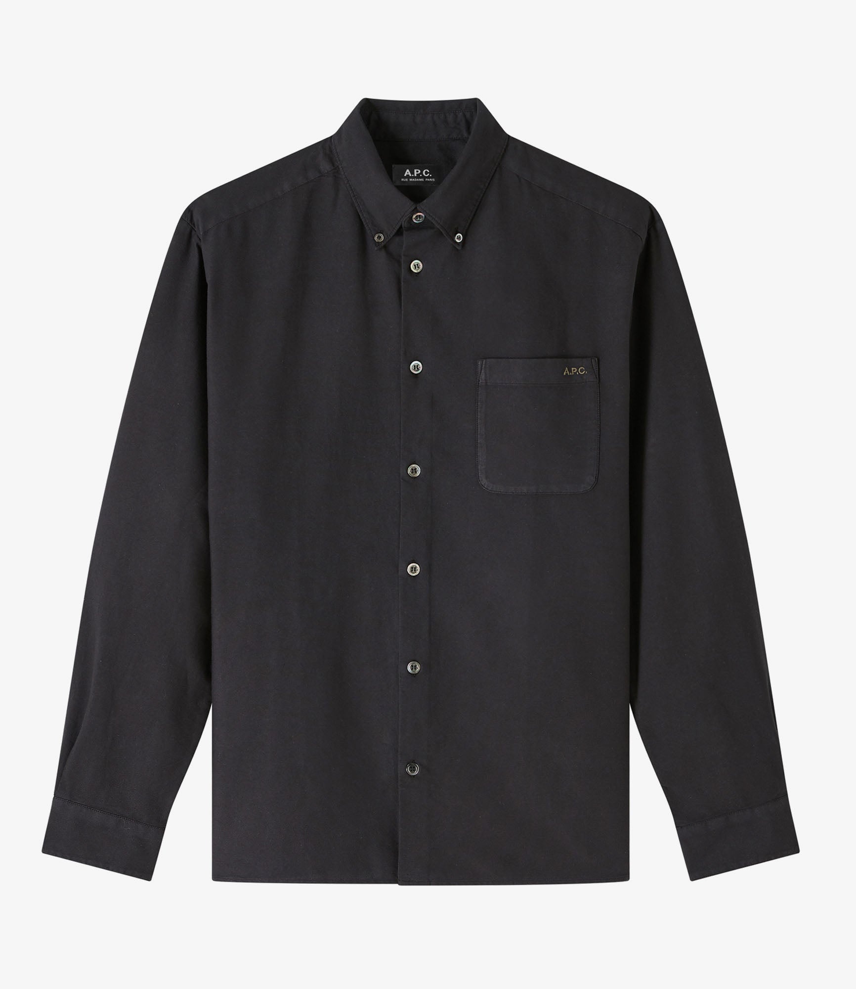 - Soft breathable material. - Straight cut with a slightly loose fit. - Button-down collar. - One pocket over the heart embroidered with a contrasting A.P.C. logo. - Buttons engraved A.P.C. - 100% organic cotton. Size Advice - Model is 6'1 tall and is wearing size M. Composition & Material - 100% cotton. - Portuguese material. - Made in Tunisia. - Machine wash cold (86°F) inside-out.