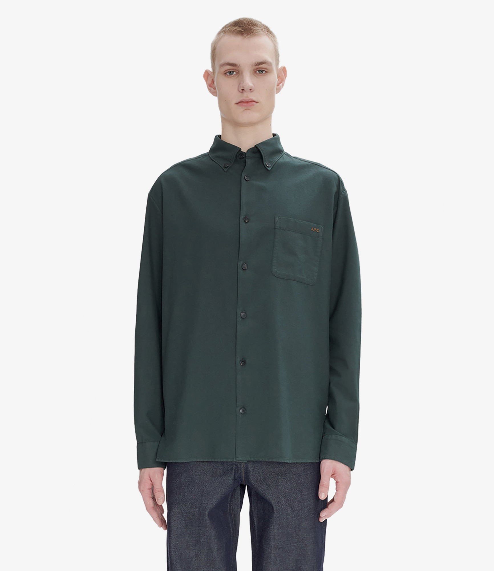 - Soft breathable material. - Straight cut with a slightly loose fit. - Button-down collar. - One pocket over the heart embroidered with a contrasting A.P.C. logo. - Buttons engraved A.P.C. - 100% organic cotton. Size Advice - Tim is 6'2 tall and is wearing size M. Composition & Material - 100% cotton. - Portuguese material. - Made in Tunisia. - Machine wash cold (86°F) inside-out.