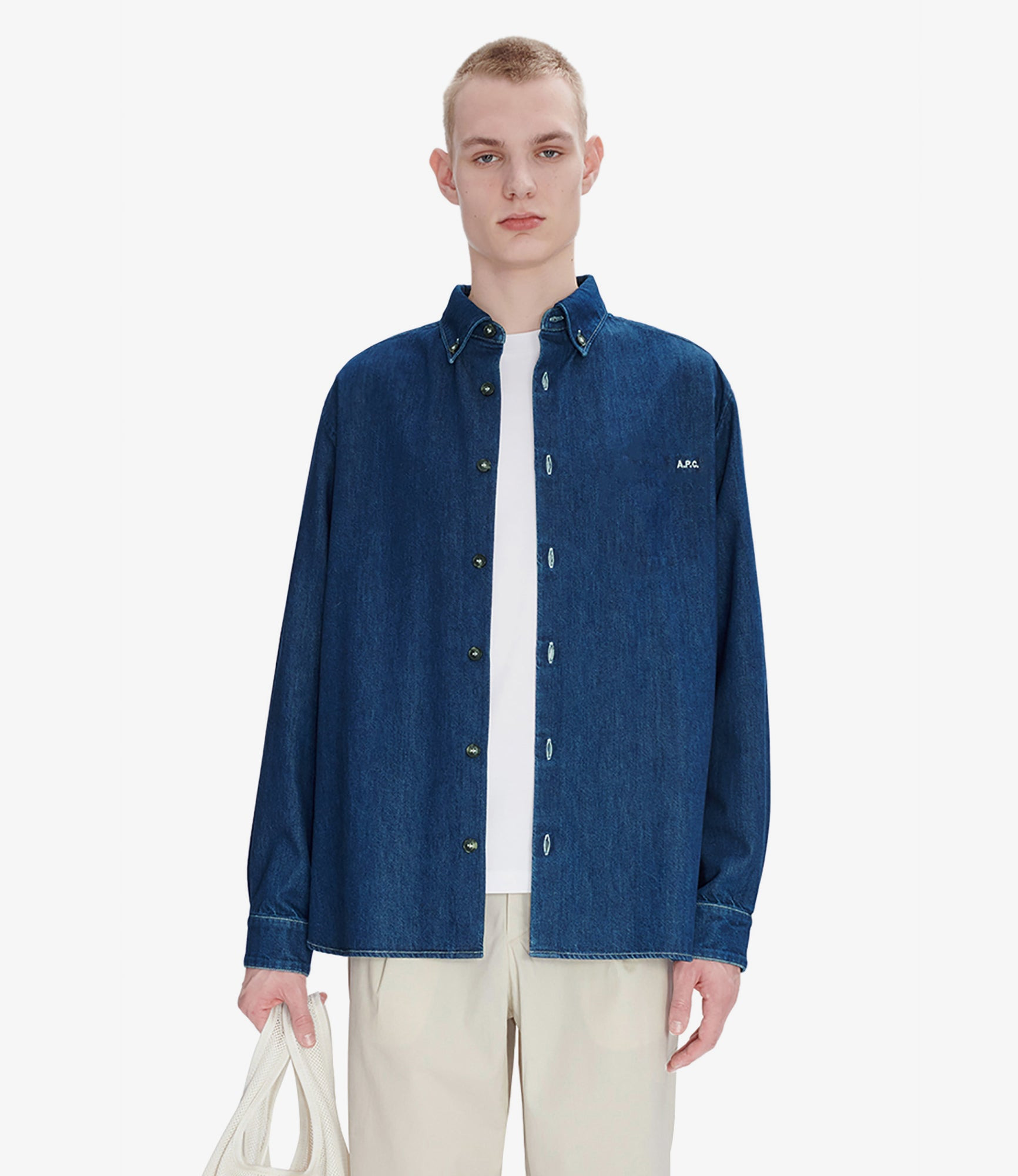- Straight cut. - Classic collar. - Ecru A.P.C. logo embroidered over the heart. - Faux horn buttons. - Ecru topstitching. - 100% organic cotton. Size Advice - Tim is 6'2 tall and is wearing size M. Composition & Material - 100% cotton. - Italian material. - Made in Tunisia. - Machine wash cold (86°F) inside-out.
