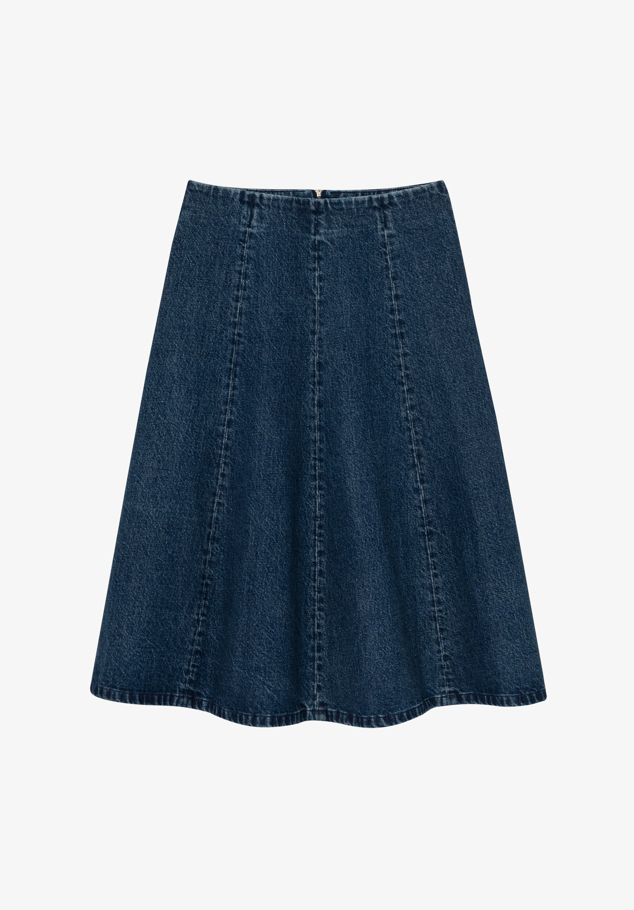 - Japanese denim material. - Flared cut. - Below-knee length. - Mid-rise. - Zip closure in back. - 100% organic cotton. Size Advice - Nadine is 5'9 tall and is wearing size 36. Composition & Material - 100% cotton. - Japanese material. - Made in Vietnam. - Machine wash cold (86°F) inside-out.