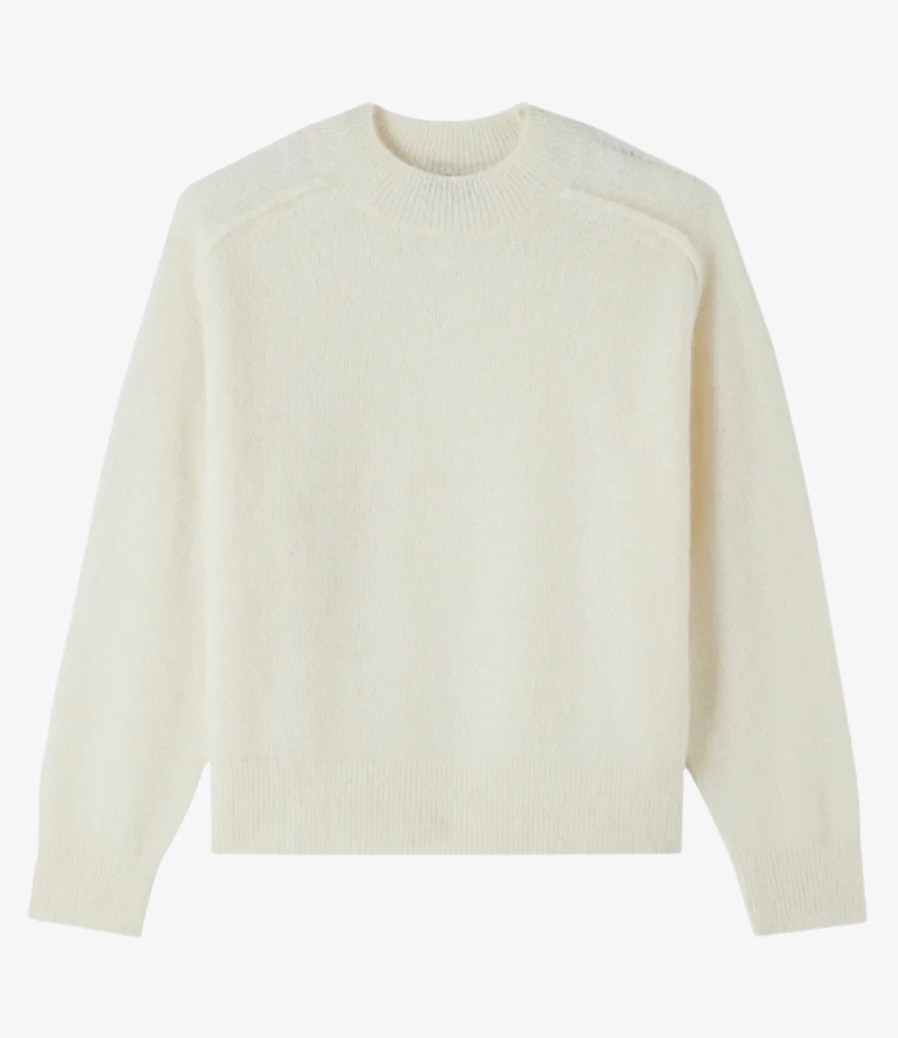 - Soft downy material. - Straight loose cut. - Crew neck. - Oversized raglan sleeves. - Textured details on the shoulders. - 25% recycled polyamide. Size Advice - Grace is 5'10 tall and is wearing size S. Composition & Material - 65% alpaca. 25% polyamide. 10% wool. - Italian material. - Made in Romania. - Hand wash or delicate cycle.