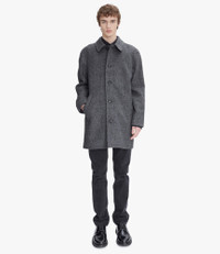 - Straight classic cut. - Classic collar. - Raglan sleeves at back. - Two side pockets. - One inside pocket. - Faux horn buttons. - Viscose lining. - 60% recycled wool. Size Advice - Leo is 6'2 tall and is wearing size M. Composition & Material - 60% wool. 20% polyamide. 15% polyester. 5% other fibers. - Italian material. - Made in Romania. - Dry clean only.