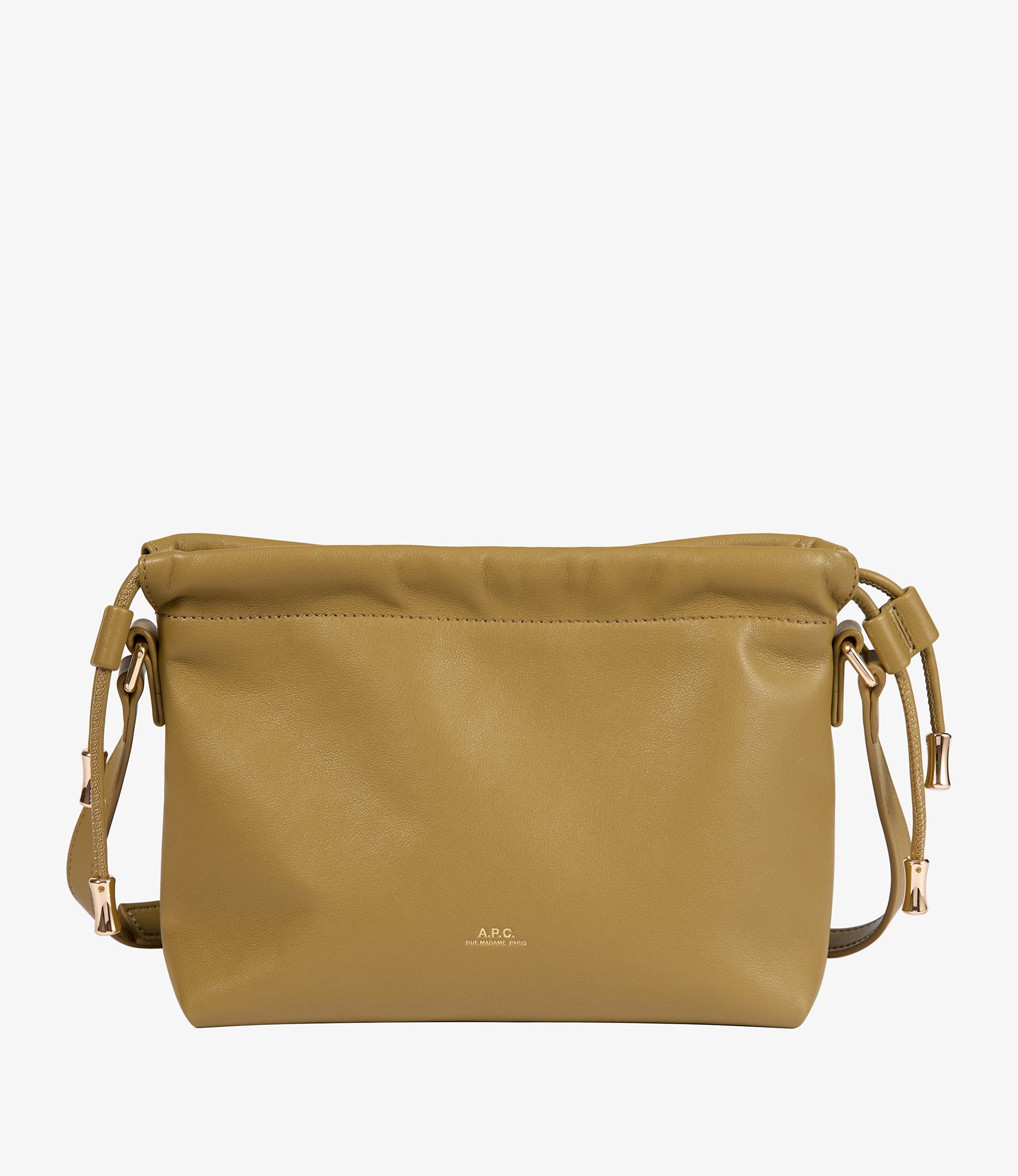 - Recycled leather-like material. - Magnetic inside closure. - Drawstring closure on the top. - Shoulder strap to wear the bag on the shoulder or as a crossbody. - One inside pocket. - Embossed goldtone A.P.C. rue Madame Paris logo on the front. - In the Ninon product line. Size Advice - Dimensions: 17 x 21 x 10 cm. Composition & Material - 55% polyurethane. 40% polyester. 5% calcium carbonate. - Made in China. - Care instructions: wipe with a soft dry cloth.