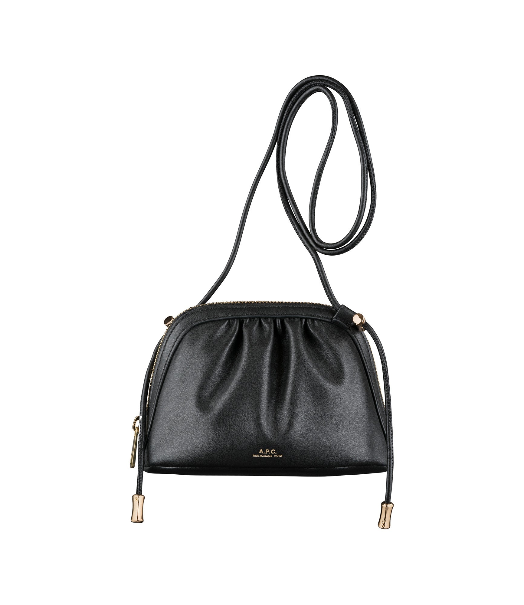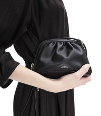 A.P.C. Women's bag. - Small version of the Ninon drawstring bag. - Vegan leather . - 1 large compartment with a goldtone zipper. - 1 exterior pocket. - Shoulder strap length can be adjusted with metallic stoppers. - Adjustable buckle to wear the bag on the shoulder or across the chest. - Goldtone 'A.P.C. Rue Madame Paris' logo. - In the same line as the Ninon bag Ninon Mini bag Ninon Shoulder bag and Ninon drawstring bag. Size Advice - Dimensions : 7.5 x 5.1 x 3.7. Composition & Material - 60% polyurethane. 40% polyester. - Made in China. - Care instructions: wipe with a soft dry cloth.