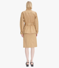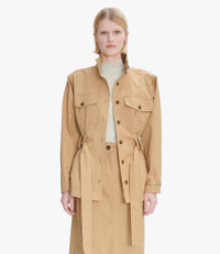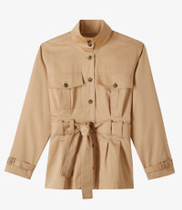 - Classic chic material. - Straight cut. - High collar with button closure. - Two breast pockets with buttoned flaps. - Two side pockets. - Removable tone-on-tone belt at the waist. - Adjustable wrists. - Back vent. - Faux horn buttons. - Water-repellent finish. - Wear with the Vicky skirt. Size Advice - Ireen is 5'10 tall and is wearing size 36. Composition & Material - 100% cotton. - Italian material. - Made in Tunisia. - Dry clean.