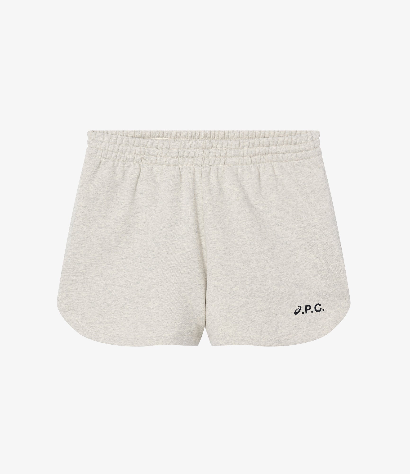 A.P.C. x Asics shorts. - Straight cut. - Mid-rise. - Mid-thigh length. - Elasticated waistband. - Two side pockets. - Black A.P.C. and Asics logo on the left. - Rounded side slits. - 100% organic cotton. Size Advice - Julie is 5'9 tall and is wearing size S. Composition & Material - 100% cotton. - Portuguese material. - Made in Portugal. - Machine wash cold (86°F) inside-out.