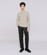 - Wide leg with a slight carrot cut. - Front pleats at the waist. - Off-centre buttoned placket. - Zip fly. - Two side pockets and one back flap pocket. - Wear with the Lazarus jacket. - 70% recycled wool. - Wear with the Jamie jacket. Size Advice - Adam is 6'1 tall and is wearing size 48. Composition & Material - 70% wool. 25% polyamide. 5% other fibres. - Italian material. - Made in Bulgaria. - Hand wash or delicate cycle.