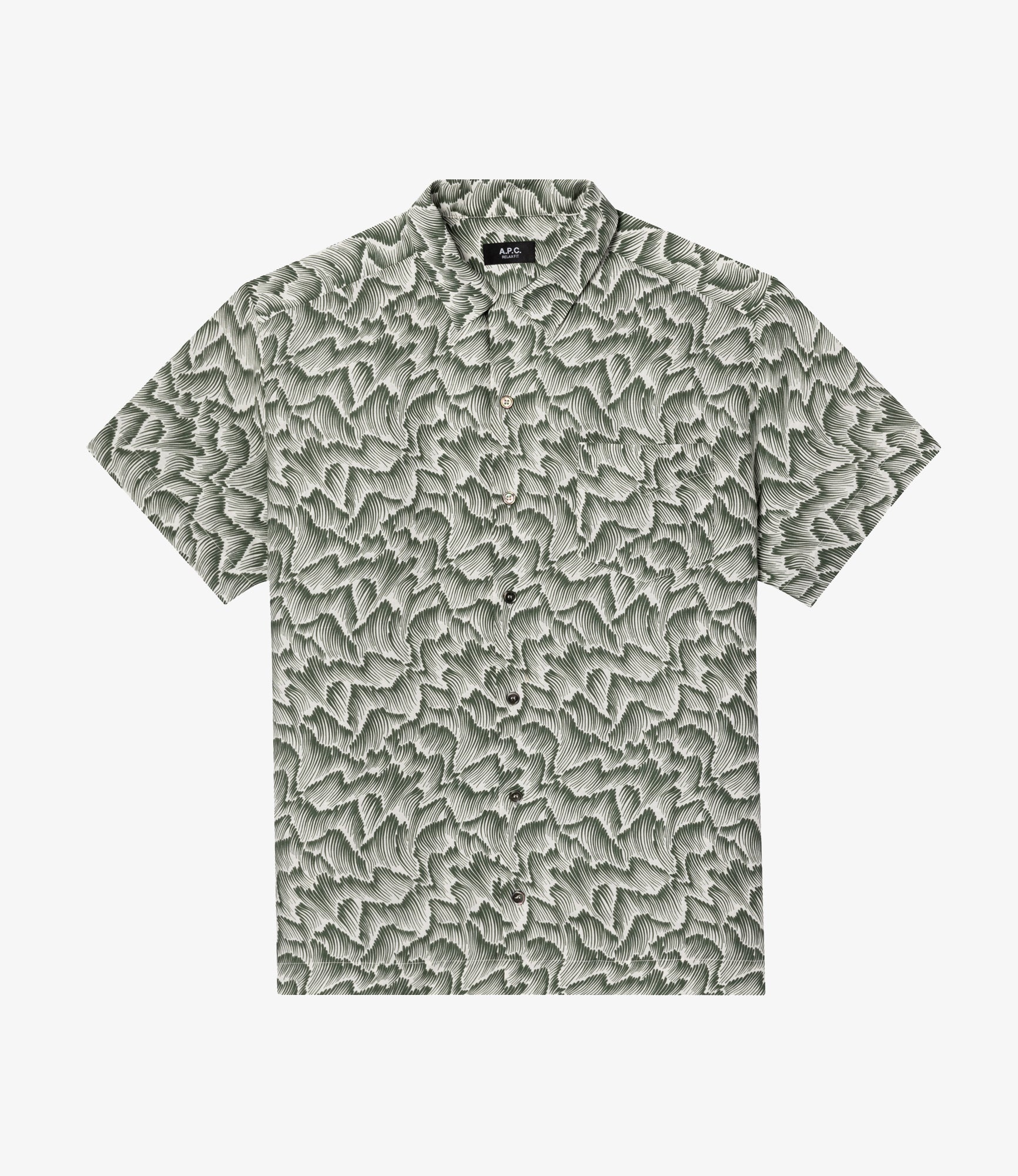 - Straight cut with a loose fit. - Classic collar. - One pocket over the heart. - Mother-of-pearl buttons. - Original A.P.C. print. - 65% viscose from certified sustainable forests. Size Advice - Leo is 6'1 tall and is wearing size M. - This item sizes normally. We recommend that you select your usual size. Composition & Material - 65% viscose. 35% linen. - Italian material. - Made in Tunisia. - Dry clean only.