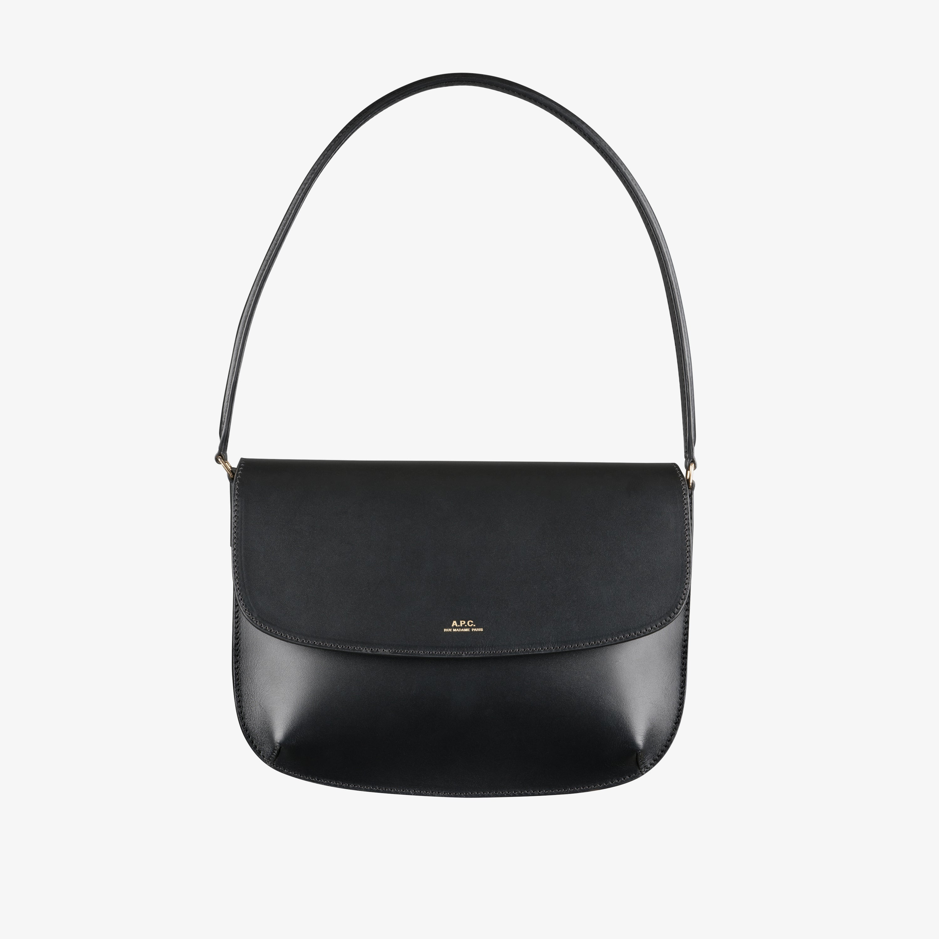 A.P.C. Women's bag. - The Sarah Shoulder bag features the same hallmarks as the iconic A.P.C. Sarah pouch but in a double pouch version. - May be carried on the shoulder or by hand. - Magnetic flap closure. - Goldtone A.P.C. rue Madame logo embossed on front. - Convex rounded bottom corners. - Cotton lining. - Inside patch pocket in the second pouch. - Topstitched leather label with A.P.C. logo inside. - Goldtone hardware. - Topstitched edges. Size Advice Strap: 5.51 in. Dimensions: 9.25 x 7.08 in. Composition & Material - Smooth cowhide leather. - Vegetable-tanned will develop a natural patina.