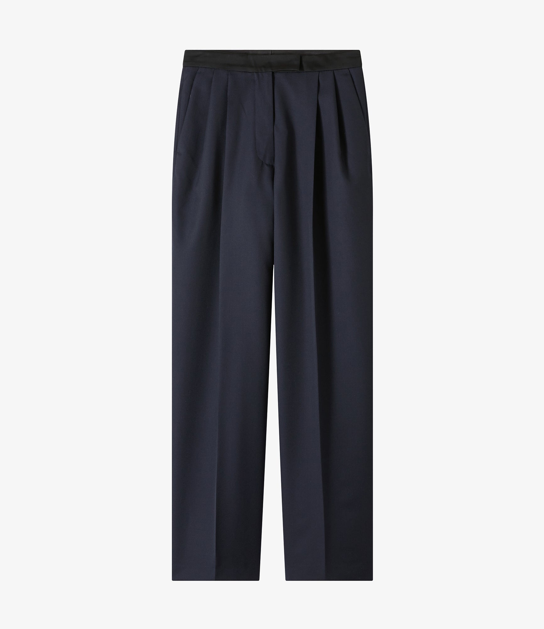 - Smooth material with an elegant drape. - High rise. - Very long straight legs. - Satin panel on waistband hides the button closure and hooks. - Two front pleats. Permanent leg creases on the front and back. - Two side pockets and two back pockets. - Wear with the Marcello jacket. Size Advice - Constance is 5'8 tall and is wearing size 36. - This item sizes normally. We recommend that you select your usual size. Composition & Material - 55% polyester. 45% wool. - Portuguese material. - Made in Bulgaria. - Dry clean only.