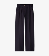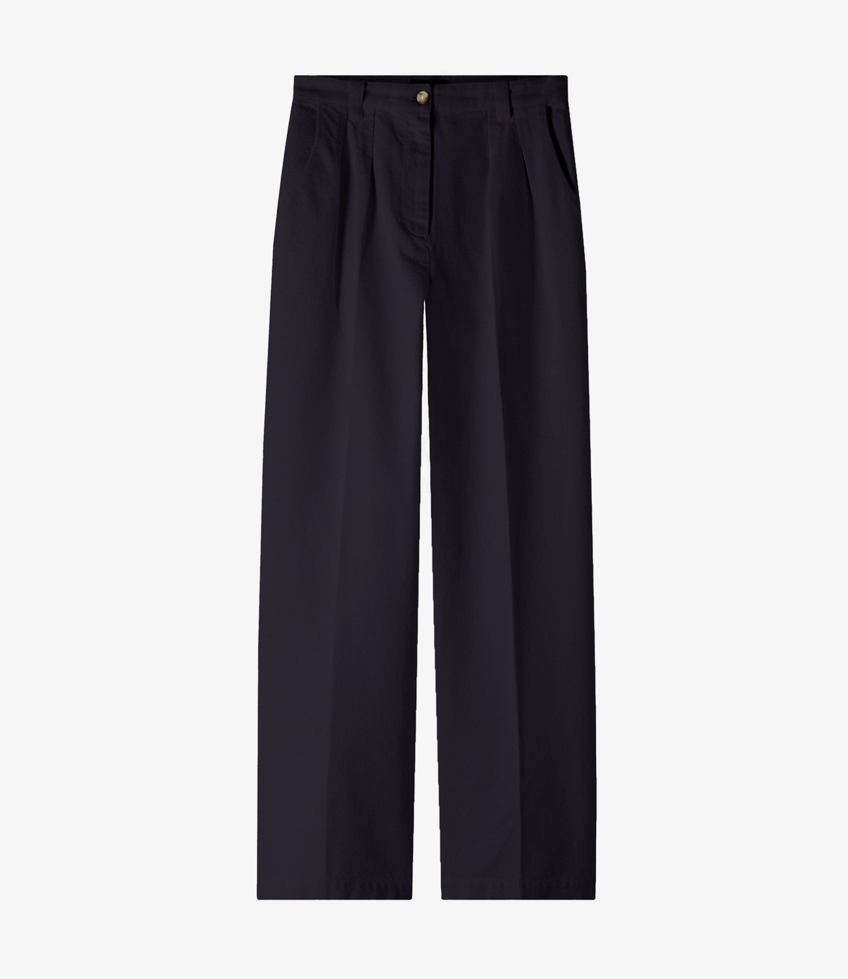 - High rise. - Wide leg with permanent creases front and back. - Pleats below the belt loops. - Zip fly. - Faux horn buttons. - 100% organic cotton. Size Advice - Grace is 5'10 tall and is wearing size 36. Composition & Material - 100% cotton. - Spanish material. - Made in Tunisia. - Machine wash cold (86°F) inside-out.