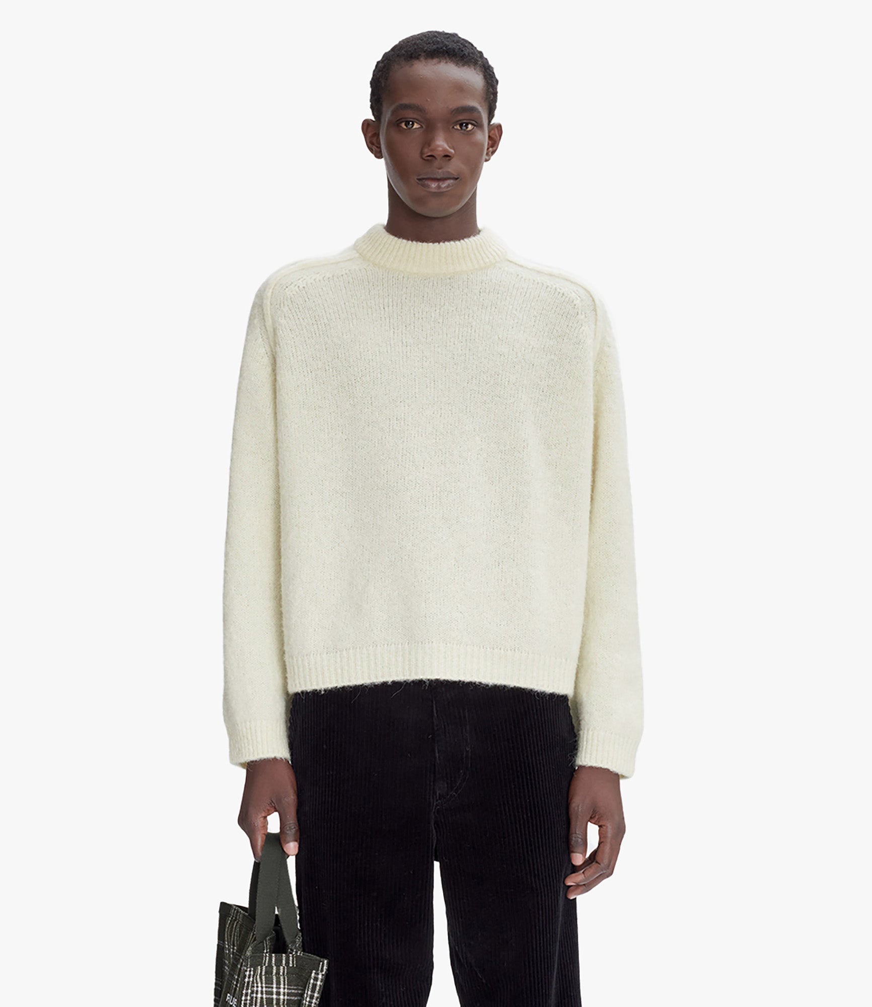 A.P.C. Men's knit sweater. - Soft downy material. - Straight loose cut. - Double-thickness mock turtleneck. - Raglan sleeves. - 25% Recycled polyamide. Size Advice - Hatim is 6'2 tall and is wearing size M. - This model fits true to size; choose your usual size. Composition & Material - 65% Alpaca wool. 10% Wool. 25% Polyamide. - Italian material. - Made in Romania. - Machine wash delicate cycle or by hand.