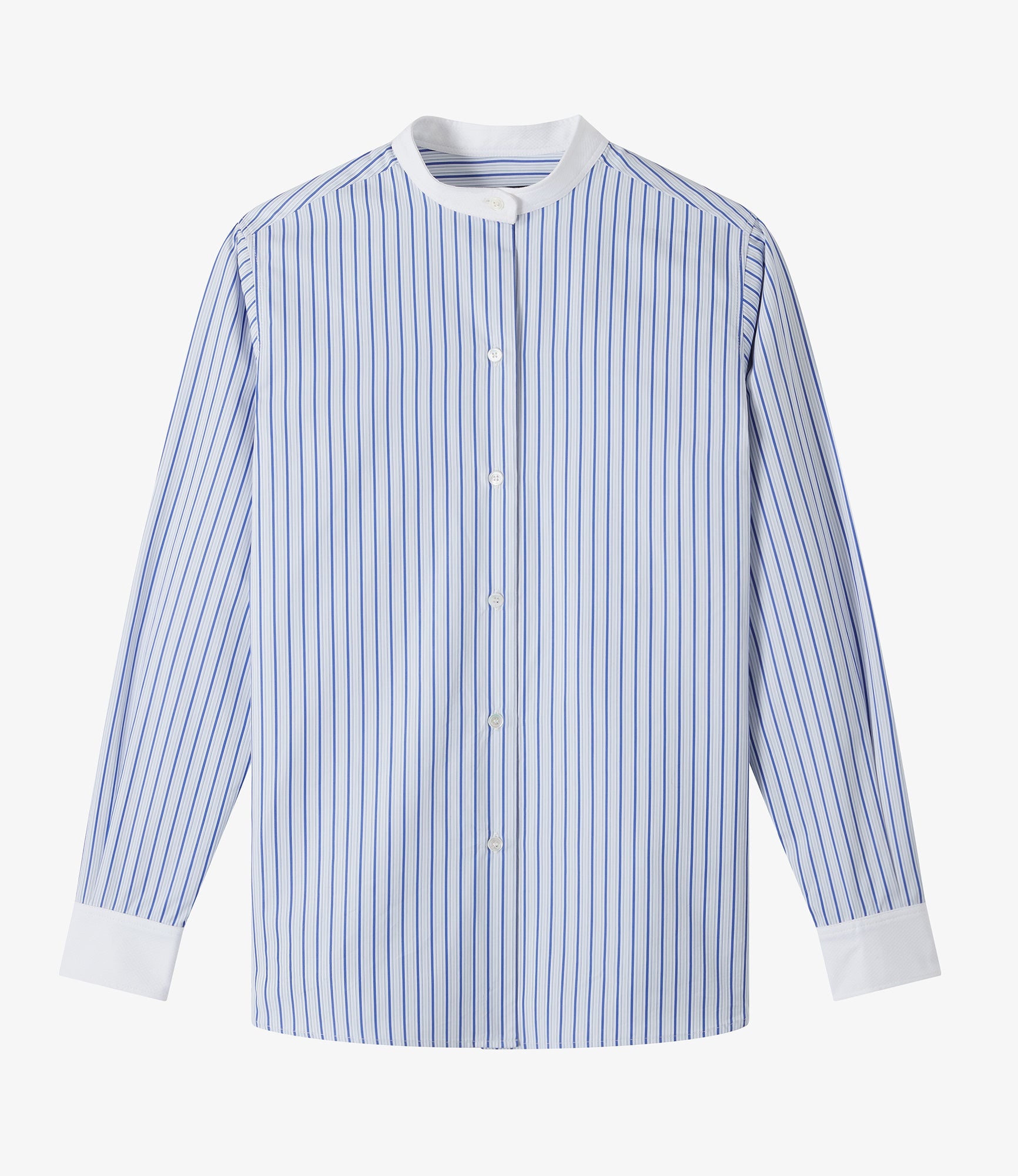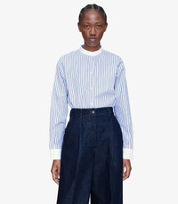 - Straight cut with a loose fit. - White officer collar in cotton pique. - Sloping shoulders. - Long sleeves in cotton pique with white cuffs. - Mother-of-pearl buttons. - Side slits. Size Advice - Grace is 5'10 tall and is wearing size 36. - This item sizes normally. We recommend that you select your usual size. Composition & Material - 100% cotton. - Portuguese material. - Made in Tunisia. - Machine wash cold (86°F) inside-out.