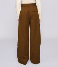 - Structured material. - Long loose cut. - Mid-rise. - Permanent crease on the front and back. - Two side pockets and one back pocket. - Hidden buttoning. Size Advice - Nadine is 5'9 tall and is wearing size 36. Composition & Material - 100% cotton. - Italian material. - Made in Tunisia. - Machine wash cold (86°F) inside-out.