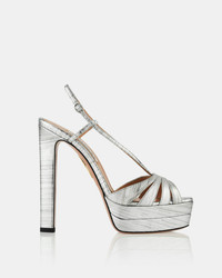 A one-of-a-kind masterpiece, the Aimee Plateau Sandals are crafted from metallic leather in an icy silver hue for a fresh take on the 70s silhouette. Befitting a powerful goddess, they rest on 130 mm block heels with stabilising platform soles and thoughtfully placed straps that keep them in place. Slingback strap Block heel Padded leather insole Signature logo detailing Product: AEEHIGB0-LCN-CCC Made in: ITALY