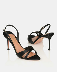 Timeless in their simplicity, the Alex Sandals are crafted from luminous black satin and set on slim stiletto heels that offer 85 mm of lift. The barely-there profile is enriched with foot-framing straps that knot at the toes, highlighting the fine Italian craftsmanship behind their creation. Slingback strap Mid heel Padded leather insole Signature logo detailing Product: AEXMIDS0-SAT-000 Made in: ITALY