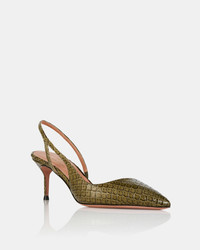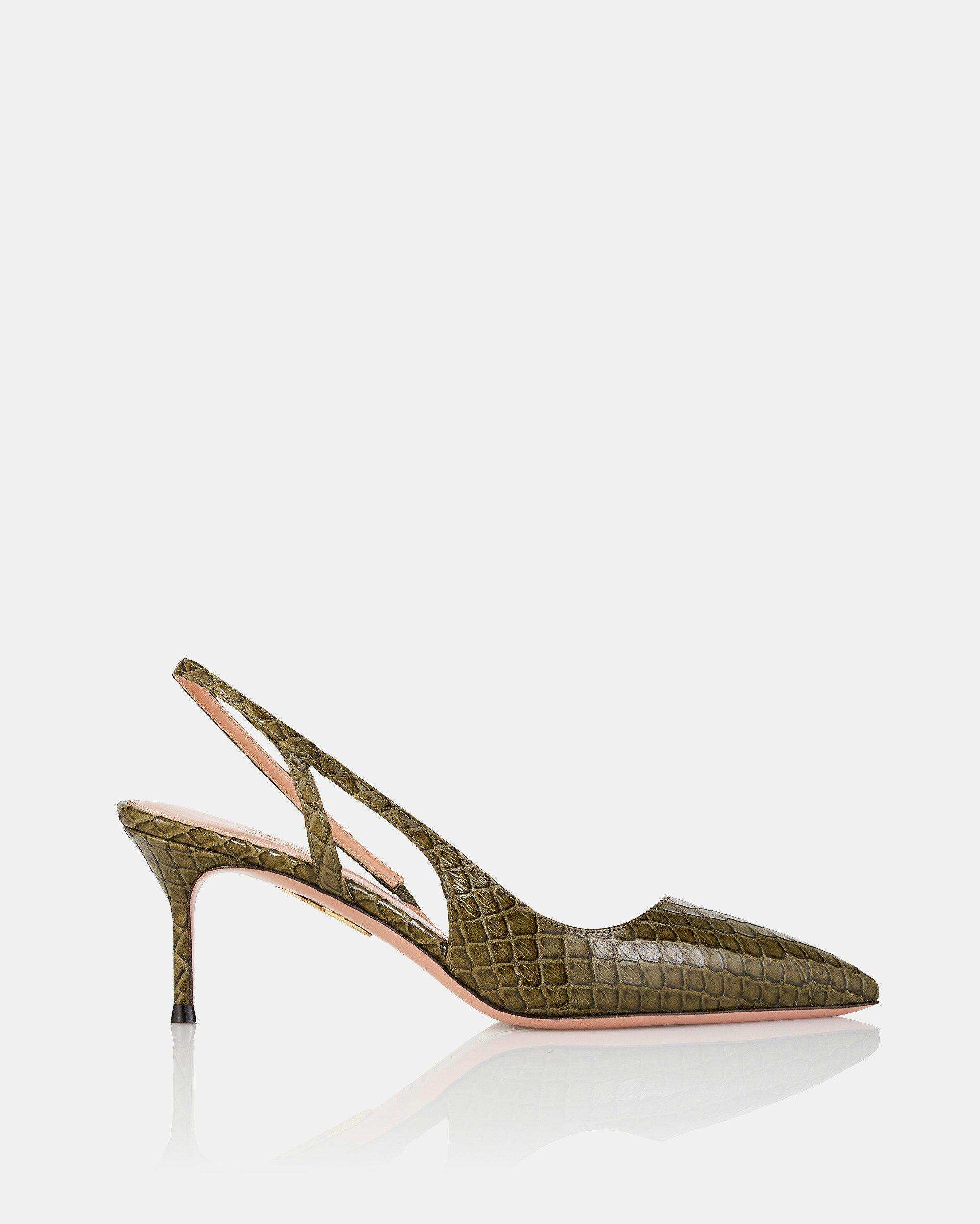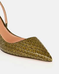 The Alex Sling Pumps channel sleek minimalism with their razor-sharp pointed toes, low-cut vamps and delicate, barely-there straps. Crafted from safari-green python-effect leather, they’re set on 65 mm kitten heels that nod to ‘90s elegance. A sophisticated yet contemporary choice for day-to-night dressing. Slingback strap Mid heel Padded leather insole Signature logo detailing Product: AEXMIDL0-PYH-SFG Made in: ITALY