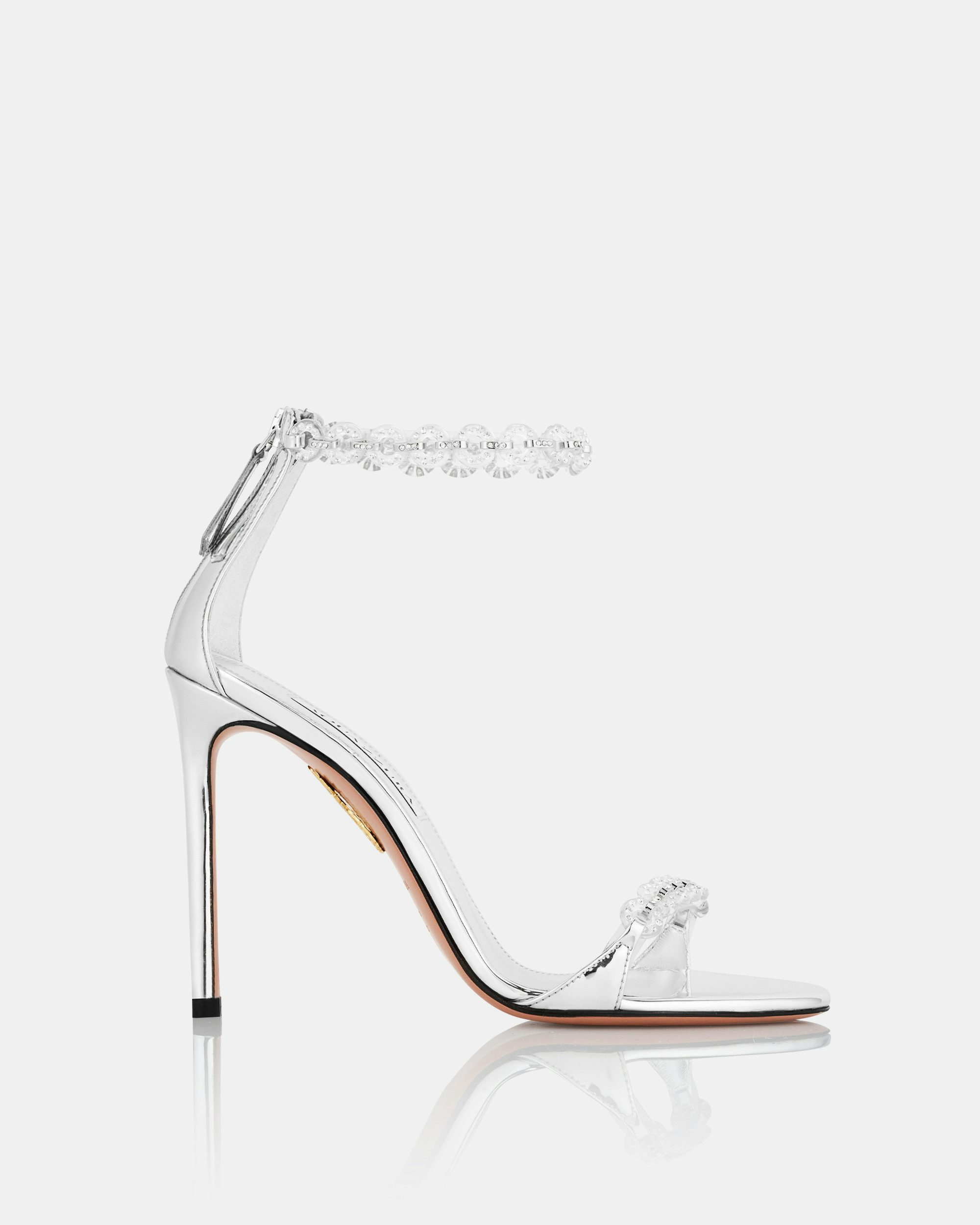 There's no holding back with these Bijoux Sandals, crafted from metallic mirror-effect leather in a bold silver hue and secured with crystal-embellished PVC straps that create a floating illusion. They're set on a 105 mm stiletto heel and finished with the brand's signature on the arch of the soles. Back zipper Stiletto heel Crystal embellishments Padded leather insole Signature logo detailing Product: BJXHIGS0-PSY-CCC Made in: Italy