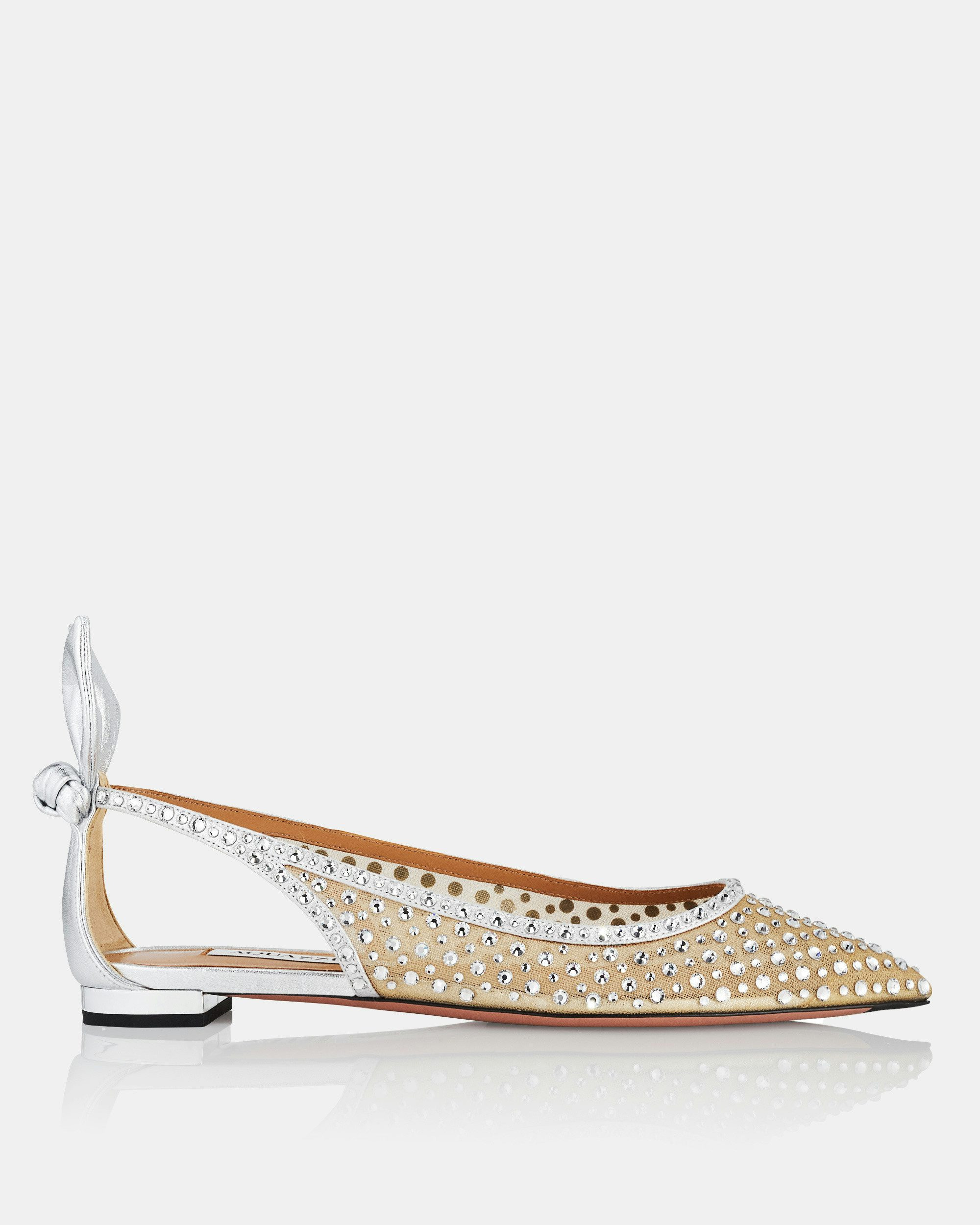 Designed to steal the spotlight from all angles, our Bow Tie Crystal Flats are instantly recognisable by the ladylike detailing at the back of each ankle. Crafted from tulle mesh punctuated with clear rhinestones in two different sizes, they feature a pointed-toe silhouette and flattering side cutouts that elongate the leg. Slip on Metallic plated heel Padded leather insole Signature logo detailing Product: DCTFLAA0-NPU-CCC Made in: Italy