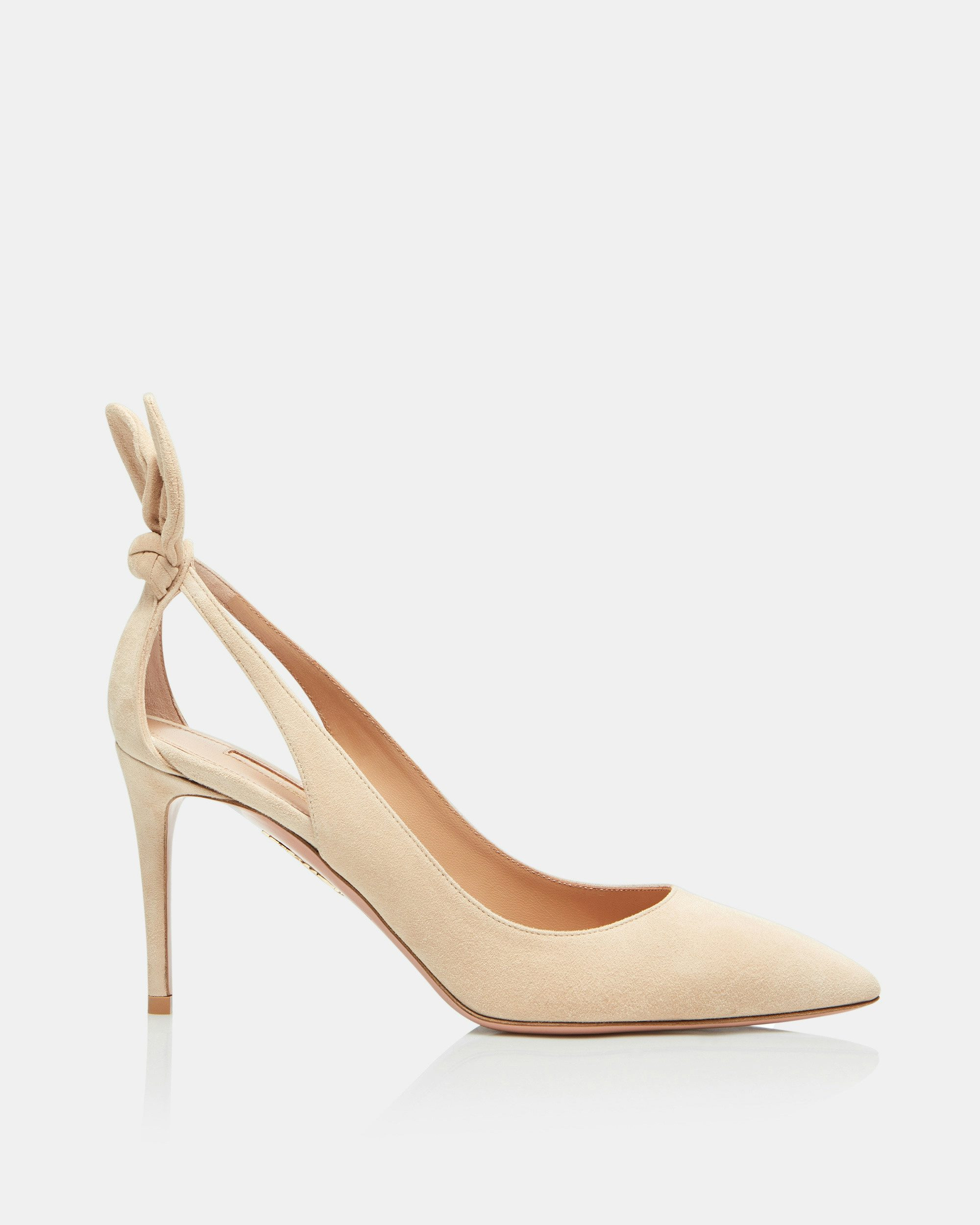 Add instant polish to your wardrobe in our Bow Tie Pump. Made in Italy from buttery suede in chic nude, the style features a flattering pointed toe, skin-revealing side cutouts and a flirty bow at the back for an extra touch of panache. They will dress up both a cocktail gown & denim equally. Covered stiletto heel Leather lining Padded leather insole Leather sole with gold dipped Pineapple logo Product: DENMIDP0-SUE-ECA Made in: Italy