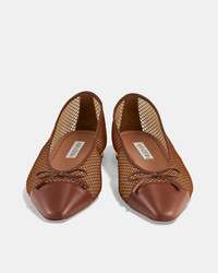 Consider these Gioia Mesh Flats every bit as iconic and timeless as Aquazzuras signature heels – with the added comfort quota. Theyre crafted from brown leather in rich shades of Tobacco and Cognac, paired with see-through panels, dainty bows at the toe caps and classically elegant 10 mm metallic heels. Wear yours with absolutely anything. Slip-on shoes Flat heel Padded leather insole Signature logo detailing Product: GIHFLAA0-MHN-TRC Made in: Italy