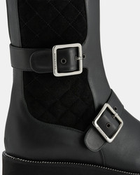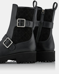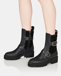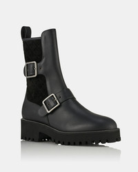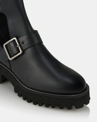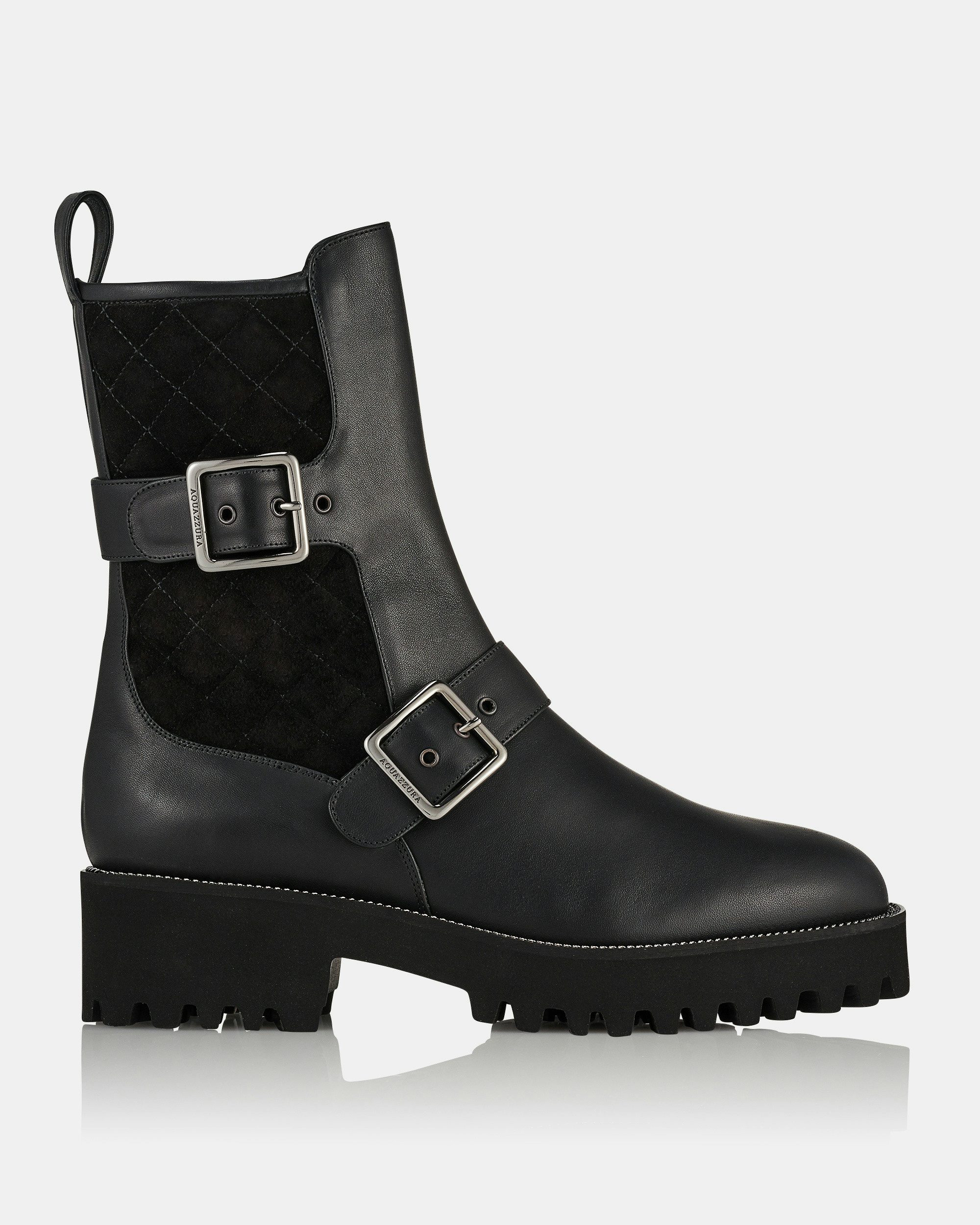 The Guy Flat Bootie has a classic biker silhouette accented with buckled straps. Crafted from soft leather and matelasse suede, this versatile black pair has a smooth round toe, a chunky rubber lug sole and a practical pull tab at the back. Ideal for facing the elements in style. Zipper along the inside Round toe Flat heel Padded leather insole Signature logo detailing Product: GUYFLAB0-SOD-000 Made in: Italy