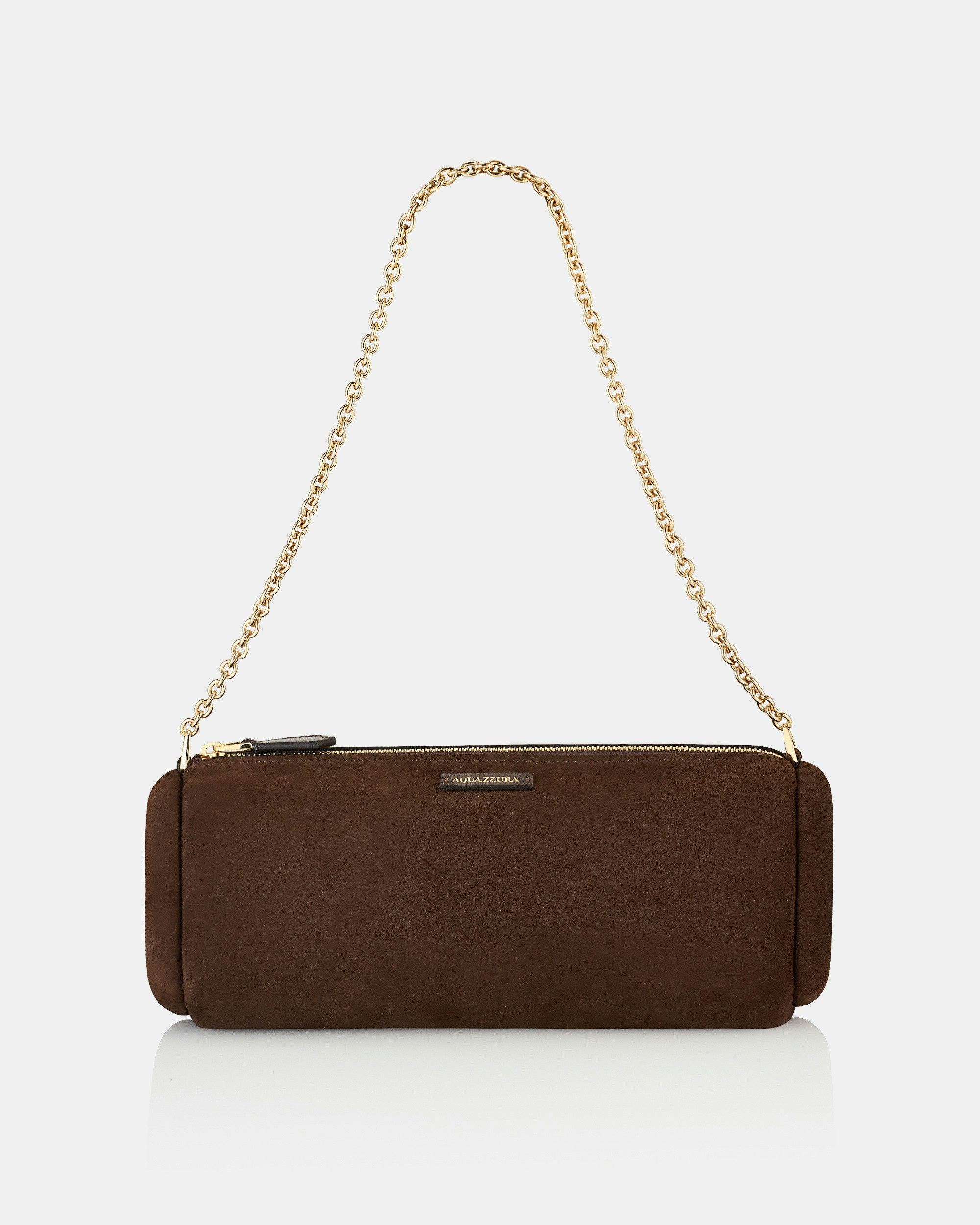 Made from espresso-brown suede in a compact, cylindrical shape and minimally detailed with light gold-tone hardware, the Hoop Mini Shoulder Bag injects a playful edge into even the most pared-back outfits. Go hands-free with the chic chain strap or carry it as a clutch to suit your mood and the occasion. Zip fastening Chain strap Signature logo detailing Aquamarine dust bag Product: HOOSHBS1-SUE-ESG Made in: ITALY