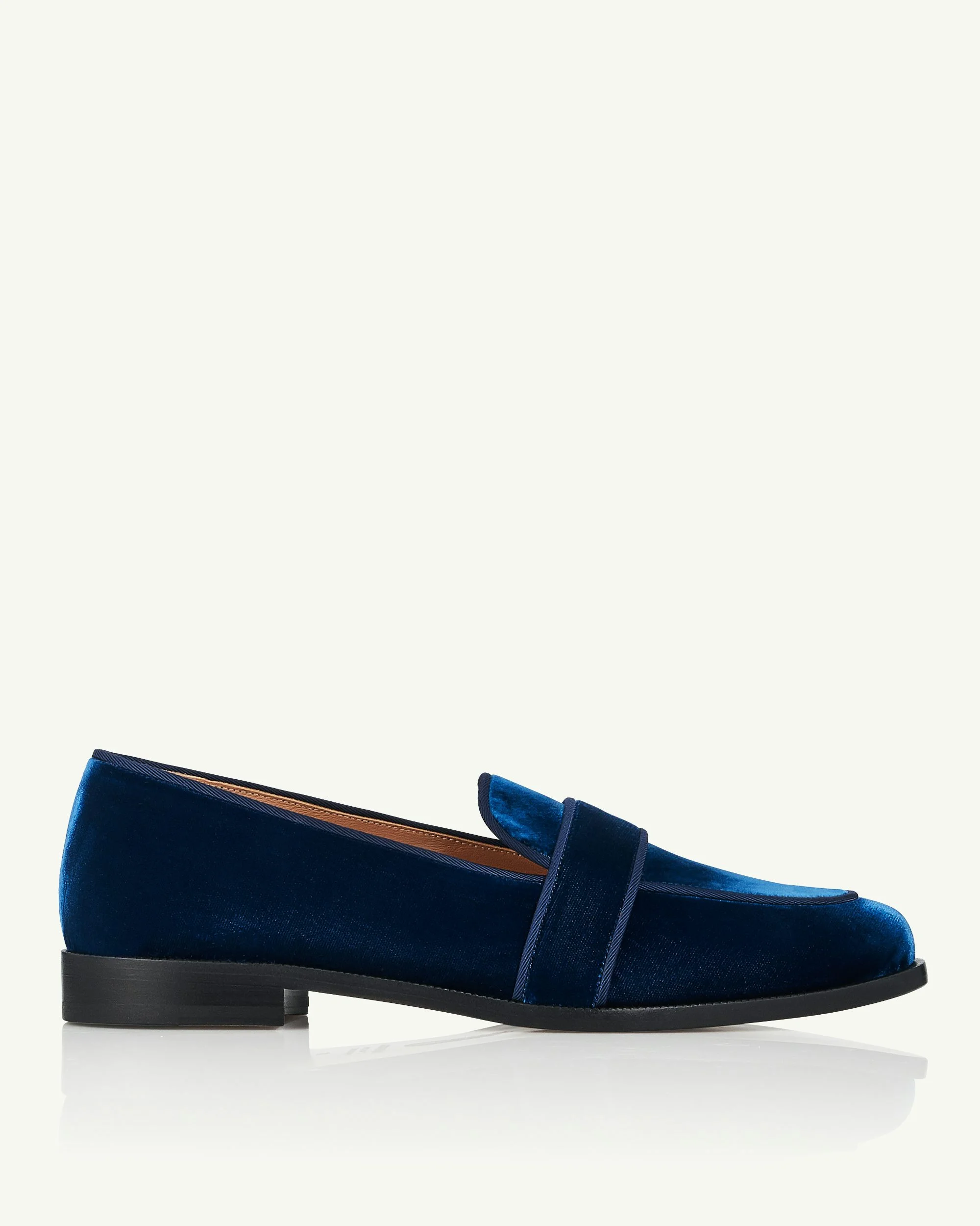 Every woman should own a classic pair of loafers in her wardrobe. Case in point: our Martin Moccasins refreshed in a regal Paris blue colourway. Crafted from plush velvet and grosgrain, the effortless silhouette features a round toe, a notched vamp and a 25 mm heel offering a little lift. Slip on Round toe Flat heel Padded leather insole Signature logo detailing Product: MTIFLAM0-VGR-PSL Made in: Italy