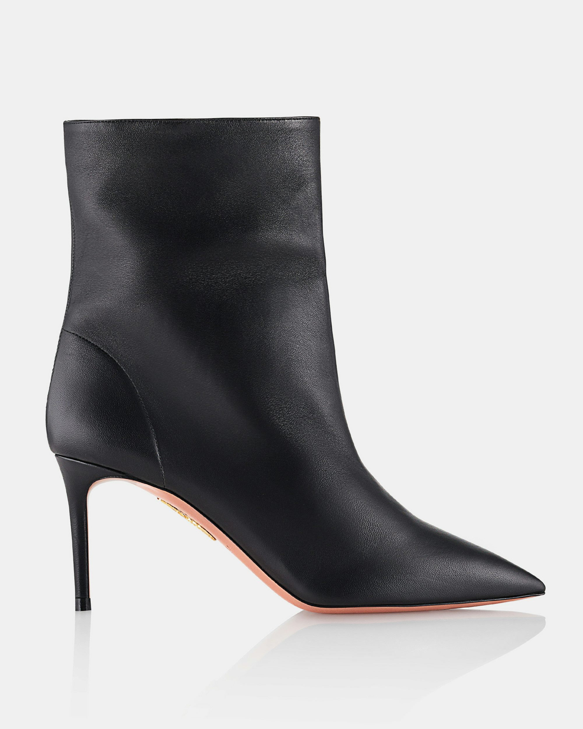 Look no further than our Matignon Bootie for all of your day to evening ensembles. Italian-crafted from smooth and supple nappa in rich black, the ankle-grazing silhouette is shaped to a feminine pointy toe and sits upon slender mid heels. Covered stiletto mid heel Pointy toe Padded insole Leather insole with 'Aquazzura' label Product: MGNMIDB0-NAP-000 Made in: Italy
