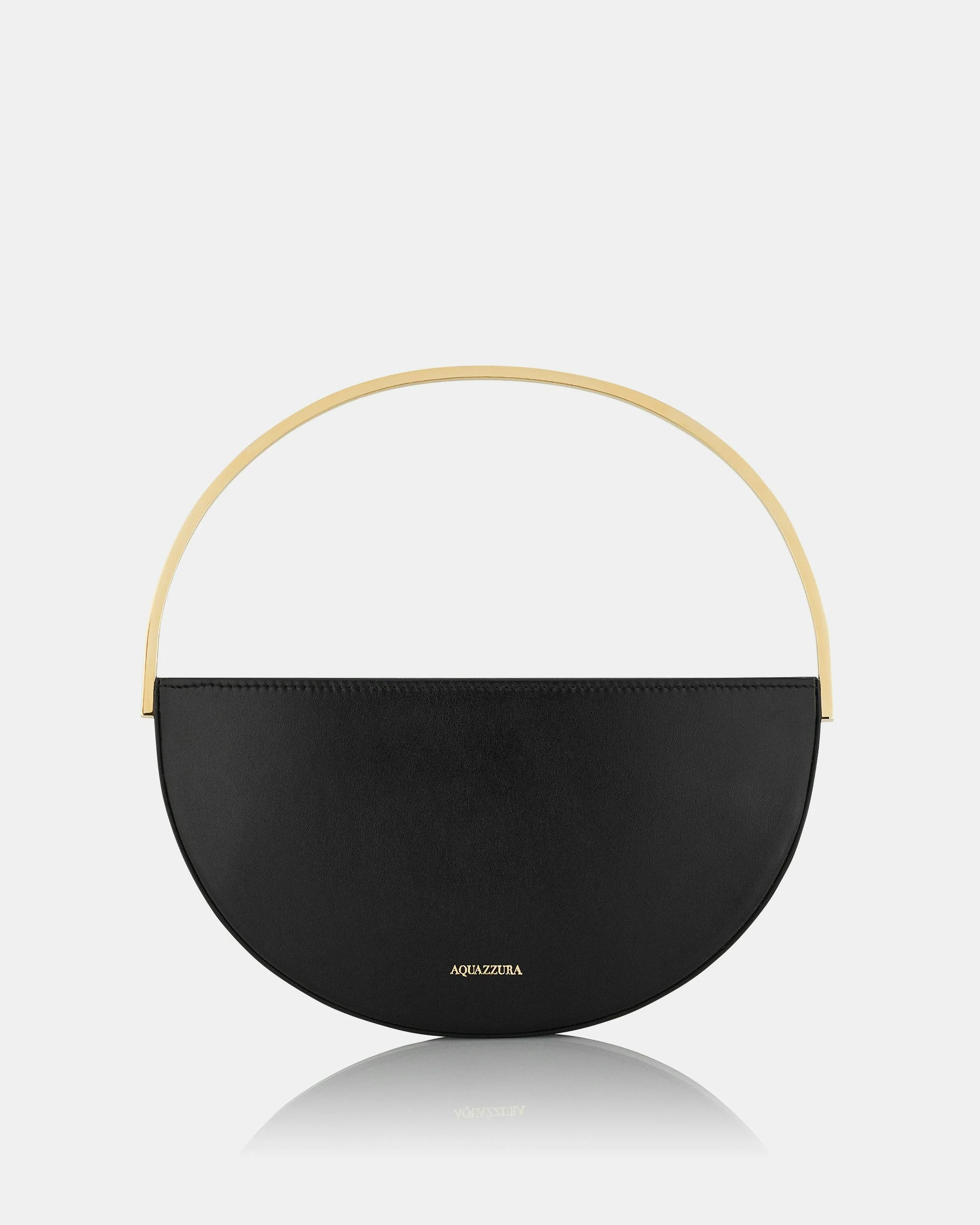 The Purist Mini Pouch bridges the gap between form and function. Crafted in Italy from smooth black calf leather, this compact handbag features a geometric half-moon shape mirrored by the curved handle in light gold-tone metal that can be folded under the bag to carry it as a clutch. Pair it with a tonal look for a minimalistic vibe, or add a sculptural, contemporary touch to more romantic ensembles. Front flap Metal handle that can be folded under the bag Detachable leather strap: 48cm Signature logo detailing Aquamarine dust bag Product: PURPOCP0-CAL-BLD Dimensions: 24L x 3W x 13H cm Made in: Italy