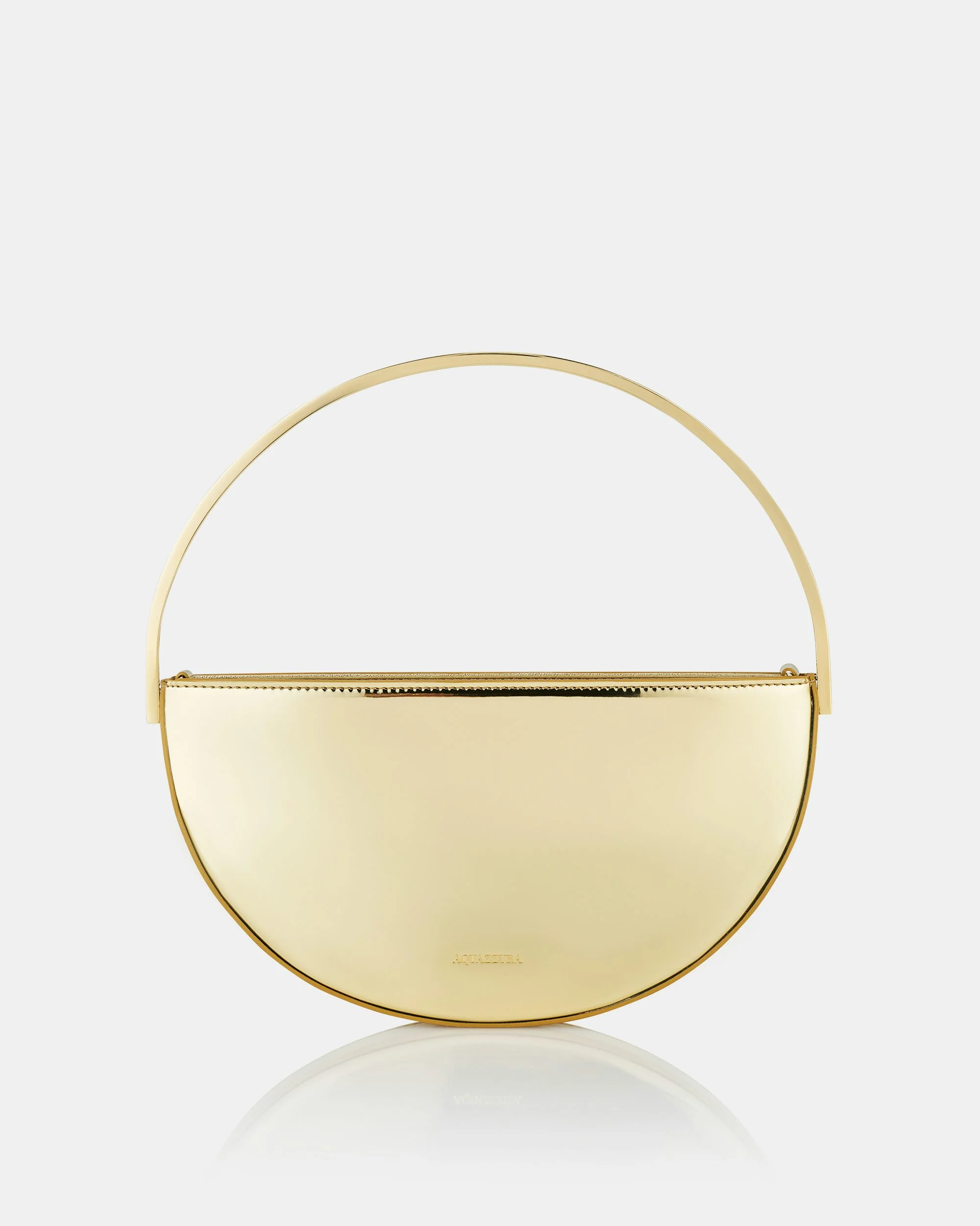 The Purist Mini Pouch bridges the gap between form and function. Crafted in Italy, this high-shine compact handbag features a geometric half-moon shape mirrored by the curved handle in gold-tone metal. The sculptural silhouette is complimented by a golden mirror-effect finish. Front flap Metal handle Signature logo detailing Aquamarine dust bag Product: PURPOCP0-SSY-SOL Dimensions: 24L x 13H x 3D cm Made in: Italy
