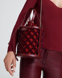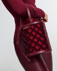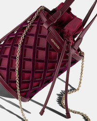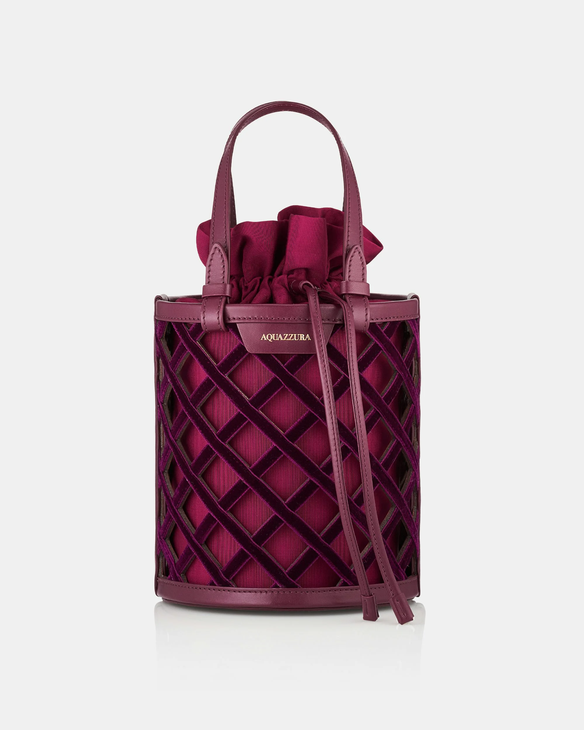 Sweet and sophisticated, our Romance Bucket Bag is crafted from panels of merlot-toned calf leather and velvet – the unique criss-cross design showcases Aquazzuras artisanal expertise. Topped with double handles and a light-gold-tone chain strap, the grosgrain lining with a drawstring closure keeps your essentials secure. Drawstring closure Top handle Detachable chain strap Signature logo detailing Aquamarine dust bag Product: RMNBCKB0-VCG-MRG Made in: Italy