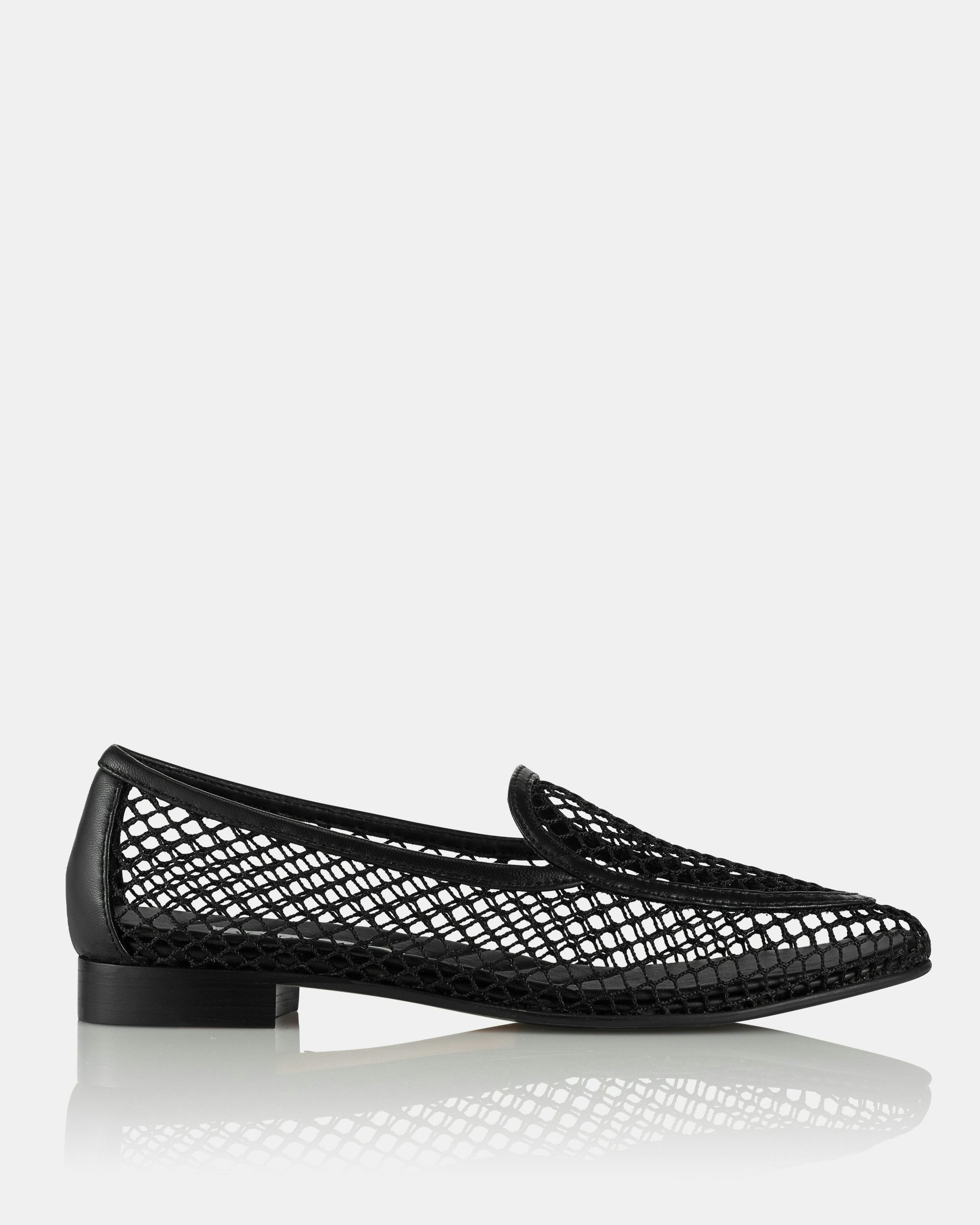 A classic with a twist — the Saint Germain Mesh Moccasin is crafted from soft leather with fishnet-style panels revealing plenty of skin. Its designed with a softly rounded toe and a 15 mm heel for subtle lift, while the timeless black hue ensures versatility and staying power. Slip-on shoe Flat heel Padded leather insole Signature logo detailing Product: SGMFLAM0-NTN-000 Made in: Italy