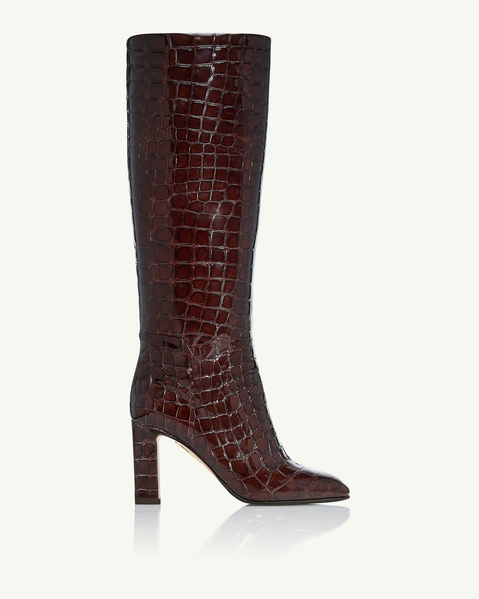 Our Sellier Boots will become the centrepiece of your cold-weather wardrobe. Crafted in Italy from Cacao brown leather with a lavish croc-embossed finish, they feature a round toe, a wide-cut shaft and an 85 mm block heel. Style yours with flirty dresses and denim alike. Pull on Round toe Mid heel Padded leather insole Signature logo detailing Product: SELMIDB0-CCX-CCO Made in: Italy
