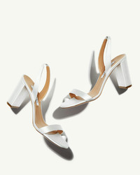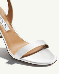 Our coveted So Nude silhouette is reimagined on a block heel. Italian-crafted from silky satin in fresh white, the minimal design is fashioned with a slender strap that wraps the toes and a comfortable slingback that keeps the foot in place. The pair is finished on a mid block heel to take you from office to evening, effortlessly. Covered block mid heel Open toe Slingback strap Leather insole with 'Aquazzura' label Product: SNBMIDS0-SAT-FFF Made in: Italy