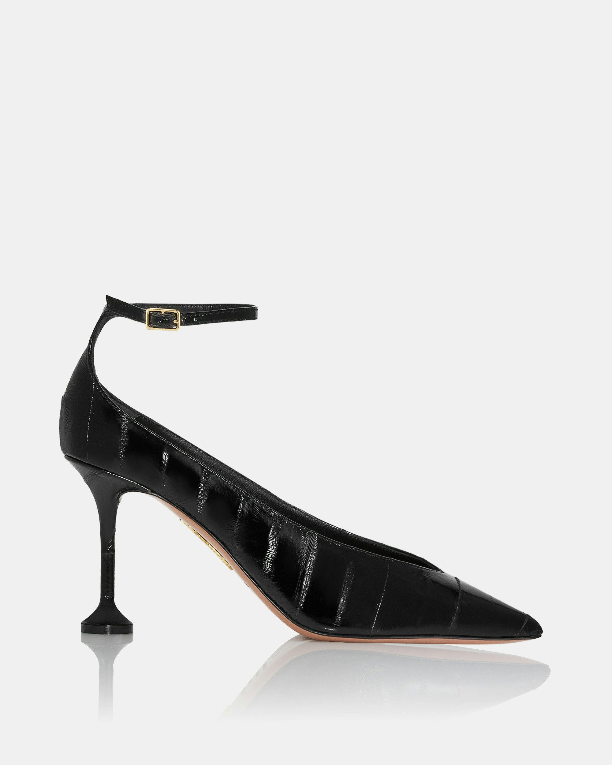 With their sharp, pointed toes, plunging vamps and fluted 85 mm heels, the Strong Pumps command attention from every angle. The precious eel leather blends smooth and glossy textures for a unique finish that brings depth and dimension to the timeless black shade. Slip on Adjustable buckle closure Mid heel Padded leather insole Signature logo detailing Product: SROMIDP0-EEL-000 Made in: ITALY
