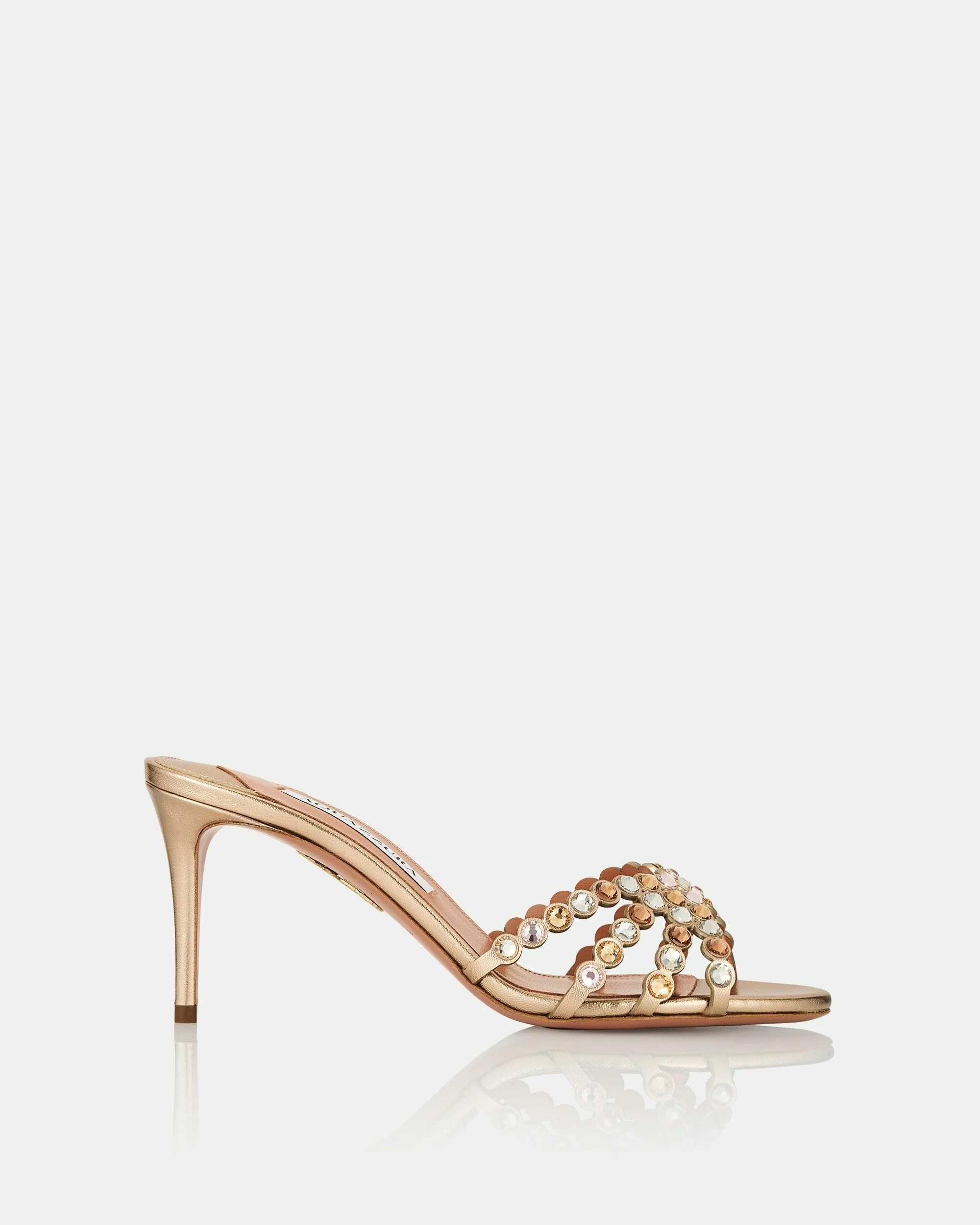 Designed to dazzle from the first step, our Tequila sandals are a sultry take on a house favourite. Crafted from laminated nappa in a radiant light copper hue, they feature scalloped straps adorned with sparkling crystals. They're set upon a comfortable mid heel to take you from cocktails to dancing. Covered stiletto mid heel Open toe Slip on Leather insole with 'Aquazzura' label Product: TQLMIDM0-NPL-LCO Made in: ITALY
