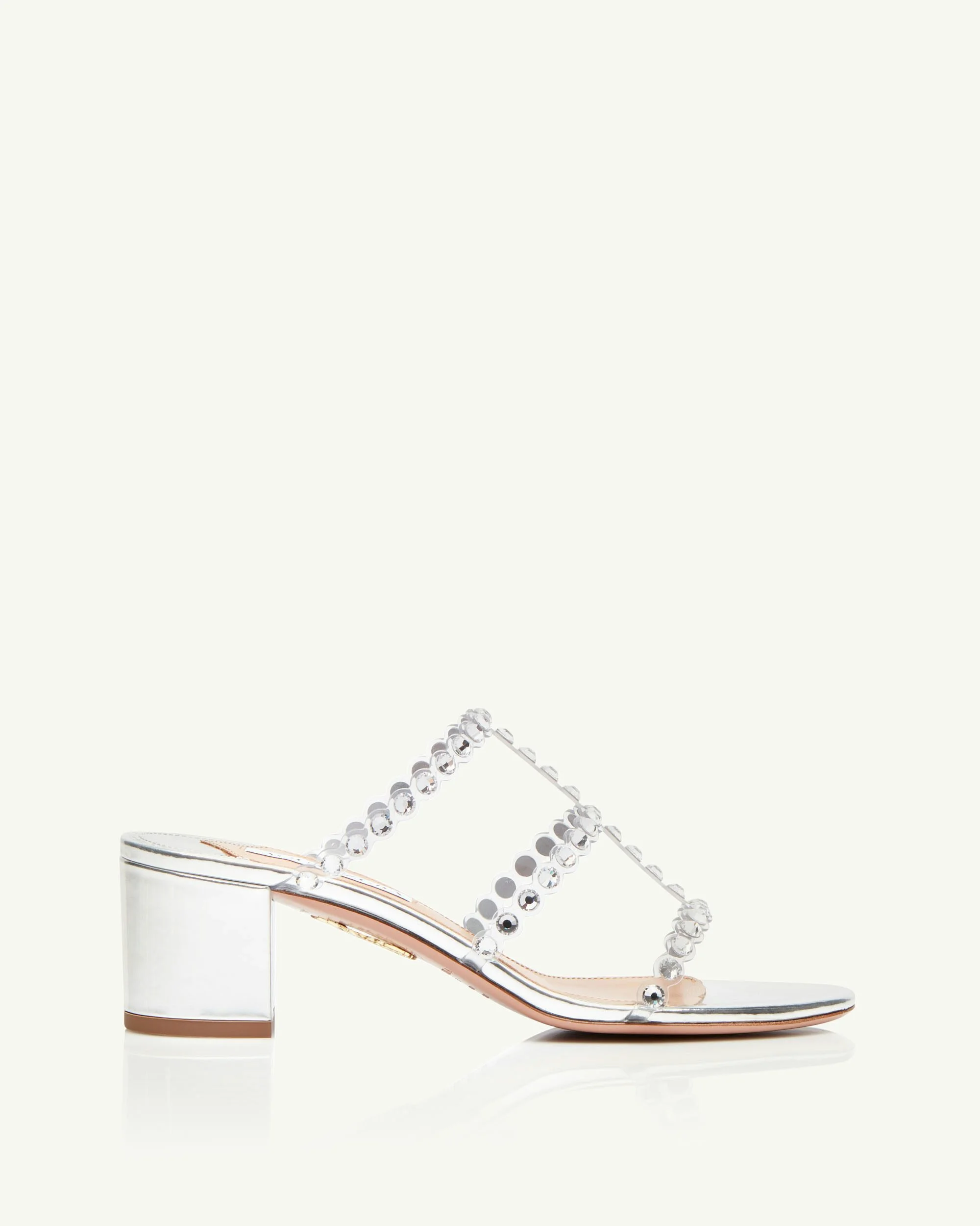 It's time to sparkle and shine in our Tequila Plexi Sandal. Meticulously designed in Italy from glossy specchio in shimmery silver and transparent PVC, the pair features slender straps adorned with glittery gems. The modest block heel allows for all-day wear. Covered block mid heel Open toe Padded leather insole Leather insole with 'Aquazzura' label Product: TQPMIDS0-SPP-CCC Made in: Italy