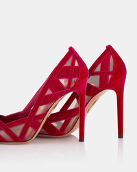 These Wrap Me Up Pumps make a stunning statement with their crisscrossing velvet straps, creating an abstract cage effect over a sheer mesh base. Designed with classic pointed toes and 105 mm stiletto heels, look closely to catch a glimpse of the label's signature gold pineapple at the sole. The mulberry- red hue is both feminine and bold. Slip on Stiletto heel Padded leather insole Signature logo detailing Product: WMUHIGP0-VFM-102 Made in: ITALY