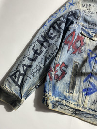 by dealing with me you acknowledge you’ve read, understood. All sales are final, no returns. •BALENCIAGA 2018 GRAFFITI DENIM JACKET •9.5/10 CONDITION •NO FLAWS •SIZE 44 ON TAG MEASUREMENT: -WIDTH 23.5 INCHES (pit to pit) -LENGHT 28.5 INCHES (TOP TO BOTTOM) if you like what I’m selling make sure to click “Follow seller” next to my name! This will allow you to keep up with all my new listings,Buy with CONFIDENT!