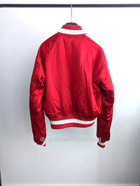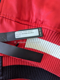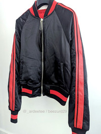 AMIRI :: WOMEN'S REVERSIBLE SILK/LEATHER STRIPE BOMBER JACKET :: BLACK/RED * BRAND NEW W/ TAGS * Amiri's silk satin bomber jacket reverses from red with white leather track stripes to black with red leather stripes. An elegant take on the classic silhouette, this U.S-made style features a luxuriously smooth finish. Striped rib-knit stand shawl collar, cuffs, bottom. Raglan sleeves. Polished silvertone hardware. Welt front pockets. Zip-front closure. 100% silk. Rib-knit: 85% cotton, 15% cashmere. Retails $2,100 USD TAGGED SIZE SMALL Shoulders: raglan / Pit: 20" / Back length: 20.5" -------------------------- 👉Faster shipping options available! @_ardeetee 👉Ships out ASAP 👉Please ignore the grailed US sizing and refer to the designer indicated size and measurements 👉All my items are BRAND NEW unless otherwise indicated 👉NO TRADES, holds, returns/exchanges. Appreciate your understanding!