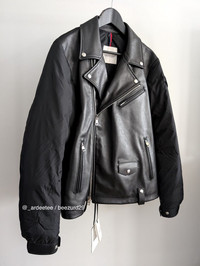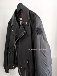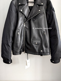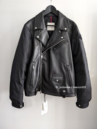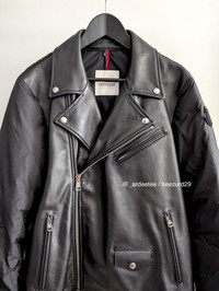 MONCLER :: PAVOT LEATHER/DOWN BIKER JACKET :: BLACK :: $6,000+ USD * BRAND NEW WITH TAGS * The Pavot biker jacket is a practical piece crafted from water-repellent nylon Fusing a biker aesthetic with Moncler’s spirit of sportsmanship, the Pavot jacket comes in a classic biker silhouette The down jacket is crafted from rainwear, a compact nylon fabric notable for its water-repellent properties A pull-out hood provides extra protection while a quilted back adds a layer of warmth Crafted from rainwear w/ rainwear lining Down-filled Adjustable, pull-out hood with elastic drawstring fastening Hem loops, collar and flap with snap button closure Back diamond quilting Zipper closure, zipped pockets Hem with elastic drawstring fastening Terry stitch logo patch Art. H20911A0012368352999 Color: Black Exterior: 100% Bull Leather Outer Front, 100% Polyamide/Nylon Sleeves; Padding: 90% Down, 10% Feather Lining: 100% Polyamide/Nylon Retails £4,473 ($6,000 USD) TAGGED SIZE 3 (fits approximately 48-50) Shoulders 18.5" / Pit 22.5" / Back length 26" / Sleeve 27.5" ---------------------------------- 👉Faster shipping options available! @_ardeetee 👉Ships out ASAP 👉Please ignore the grailed US sizing and refer to the designer indicated size and measurements 👉All my items are BRAND NEW unless otherwise indicated 👉NO TRADES, holds, returns/exchanges. Appreciate your understanding!
