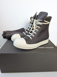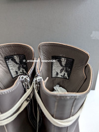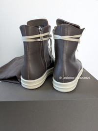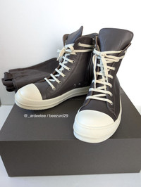 RICK OWENS :: RARE SAMPLE 1/1 LEATHER RAMONES HIGH :: DUST * BRAND NEW W/ TOTE AND BOX * RARE 1/1 SAMPLE Rick Owens Leather Ramones High Handwritten size 41 on tongue Smooth calf leather Color is a beautiful dark dust, natural deep earthy tone that changes slightly depending lighting Color: Dust/Milk Item RP02B6890/LCG Made in Italy TAGGED SIZE 41 EU Insole 11" -------------------------- 👉Faster shipping options available! @_ardeetee 👉Ships out ASAP 👉Please refer to the designer indicated size and measurements 👉All my items are BRAND NEW unless otherwise indicated 👉NO TRADES, holds, returns/exchanges. Appreciate your understanding!